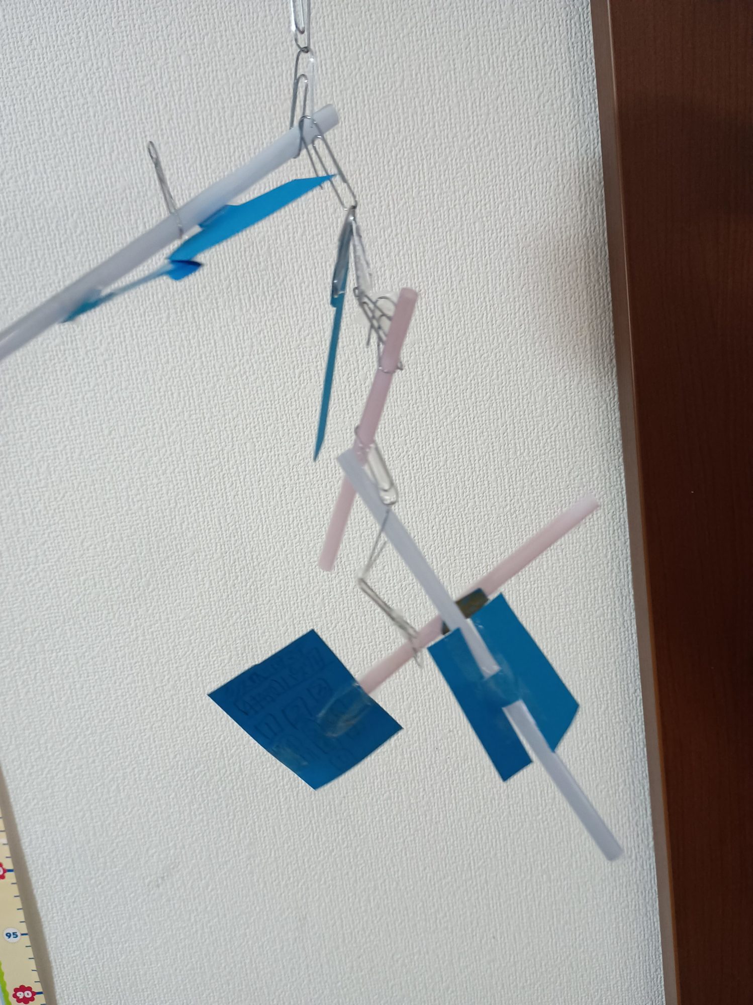 細長いストローやクリップが連なって、空中でゆらゆらと関係し合っている様子がよく見えますね。青い形と白やピンクの線の組み合わせが軽やかで、風が通るような動きが感じられていいね!