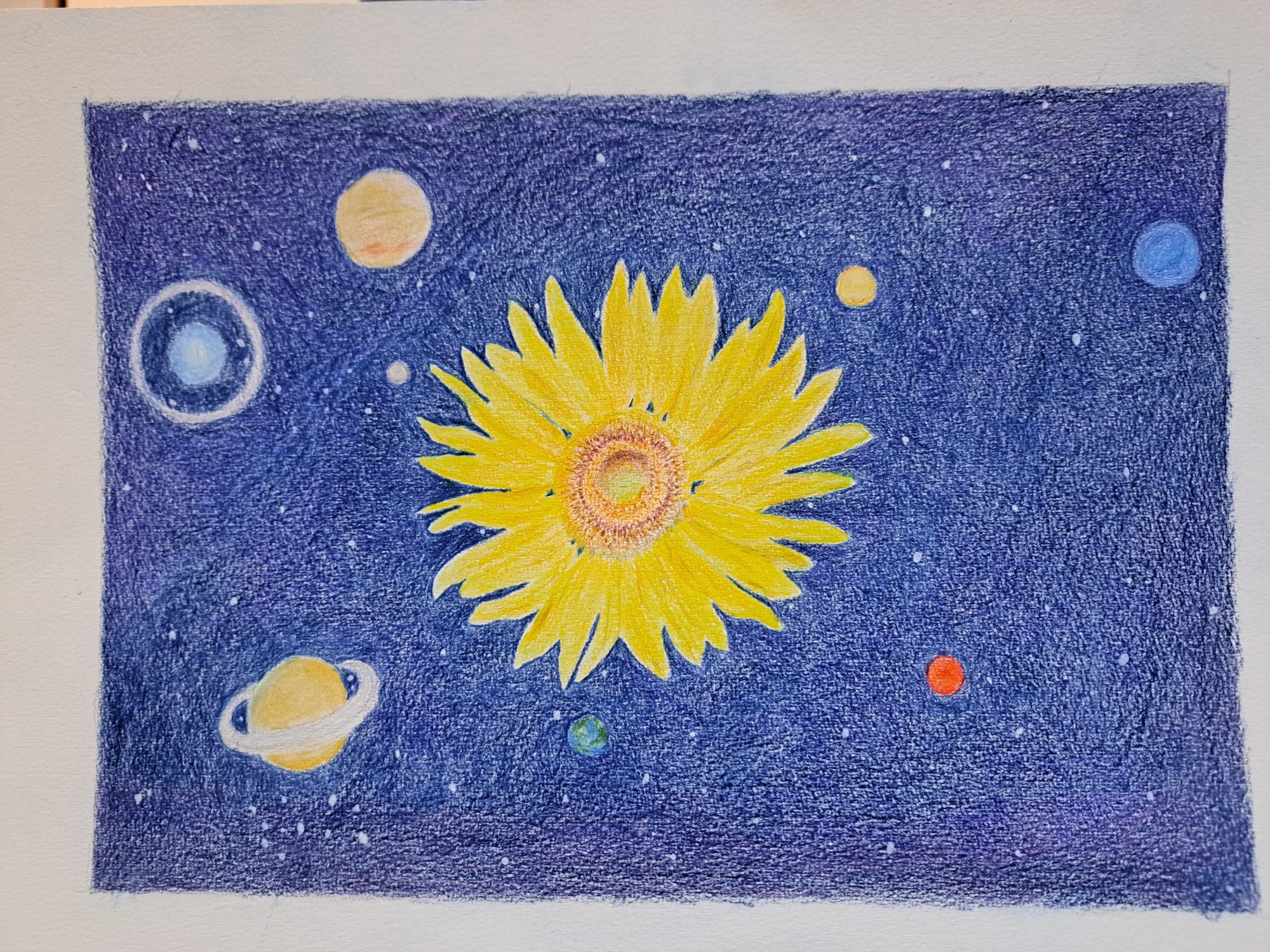 私は、このひまわりの太陽が宇宙をあたためているように感じました😊