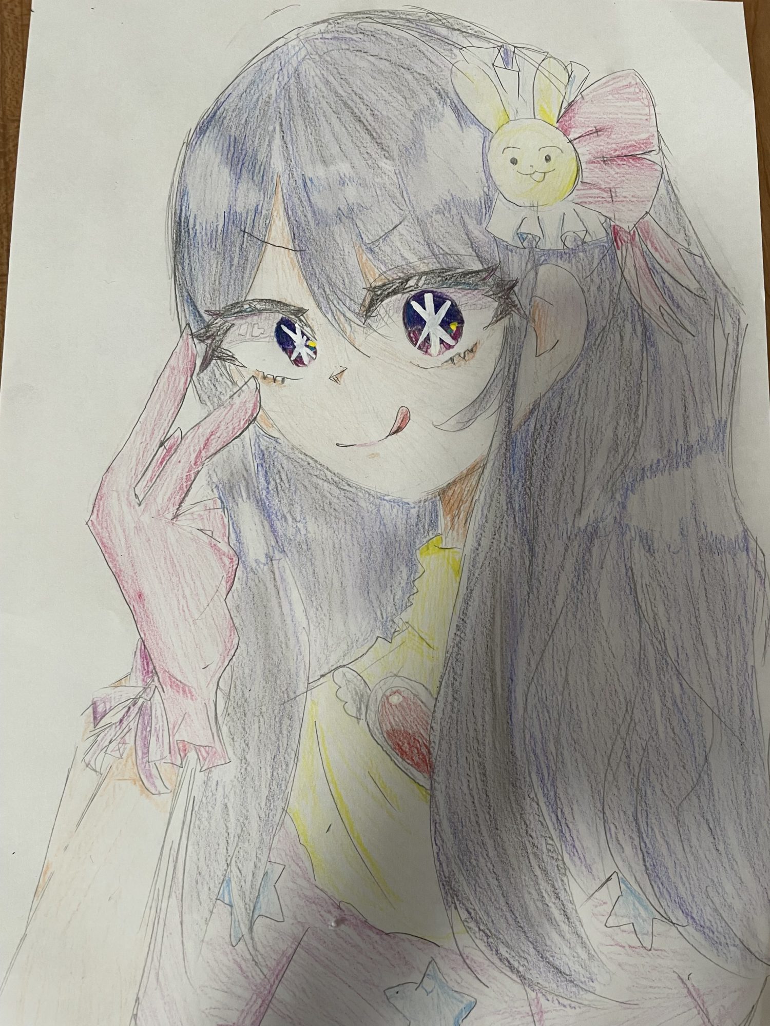 大きな瞳の中に星がきらっと光っていて、その視線だけでぐっと引き込まれました。長い髪の流れも、色鉛筆の重なりでやわらかく広がっていて、ふんわりとした空気が伝わってきていいね!✨指先のポーズや口元の表情も、キャラクターの魅力をしっかり受け止めている感じがします。