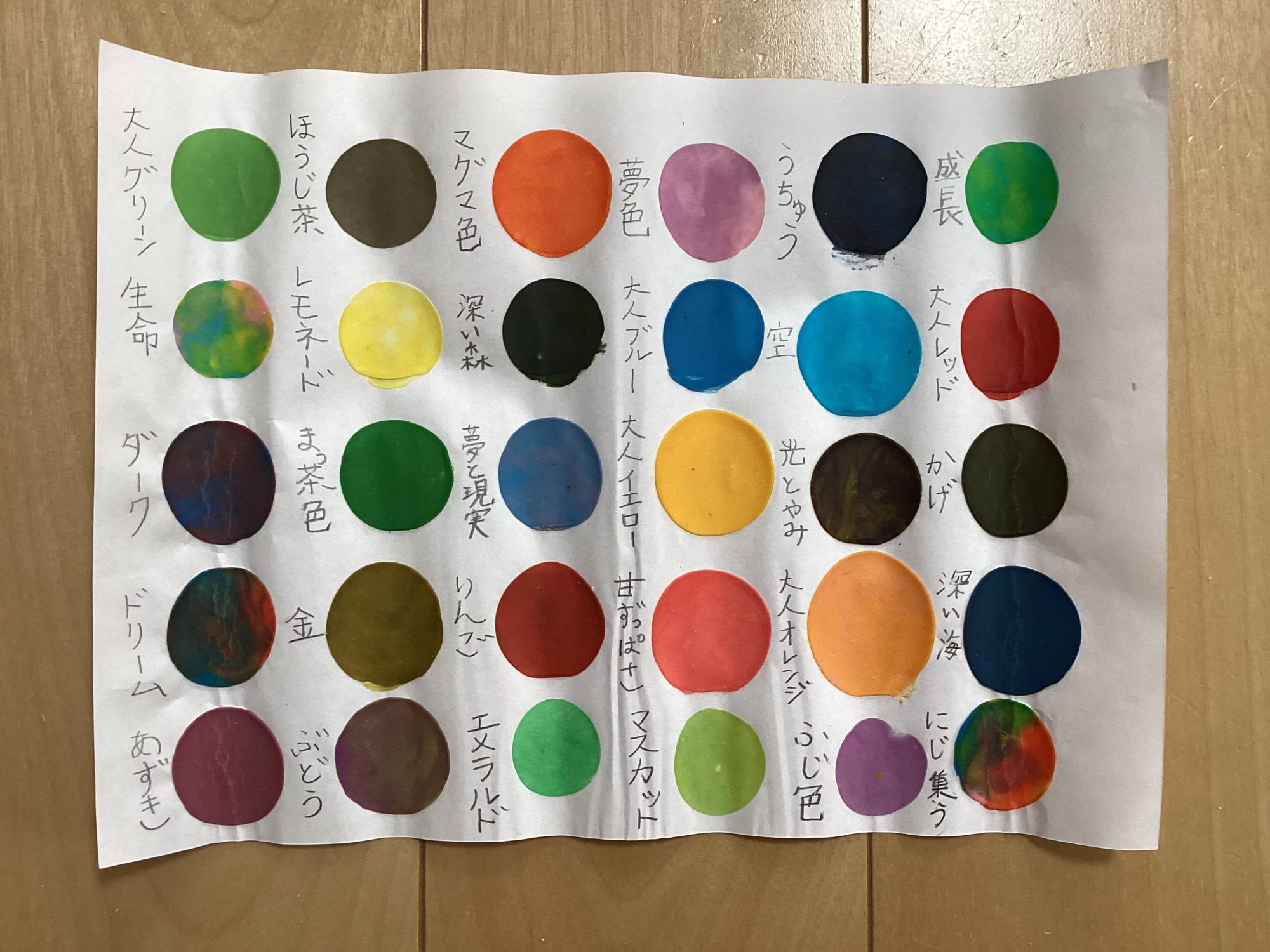 たくさんの丸い色が並んでいて、まるで色の図鑑のようでいいね!🎨✨ ひとつひとつに「大人グリーン」「夢色」「深い海」など名前がついていて、色と気持ちがつながっているのがとても面白いです。
