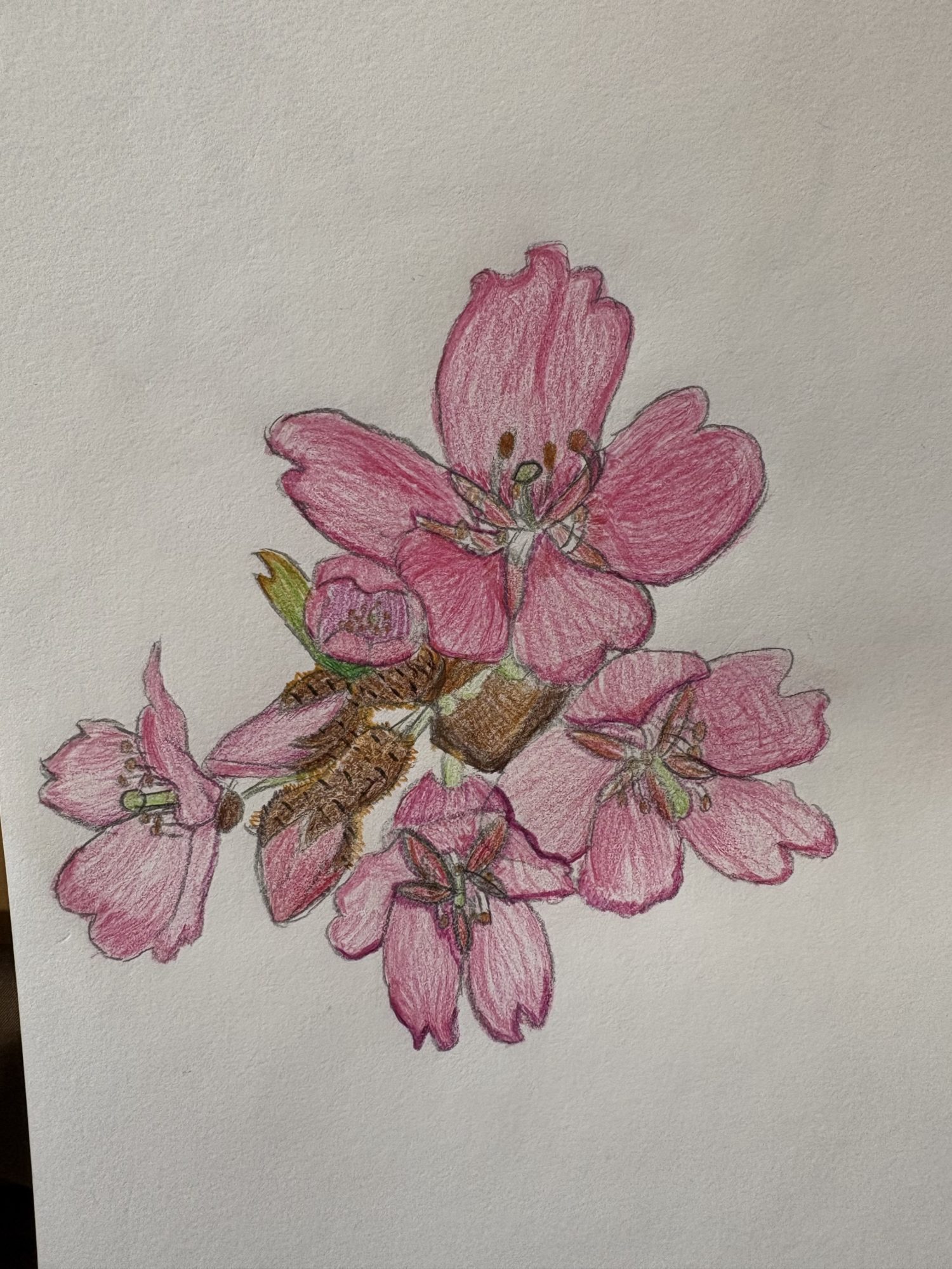 やわらかなピンクの花びらが重なり合い、ひとつひとつの形や向きの違いまで丁寧に見つめて描いているのが伝わってきます。中心のしべの細やかな線や、枝のざらっとした質感もよく感じられて、近くでじっくり観察した時間が見えるようでいいね🌸✨