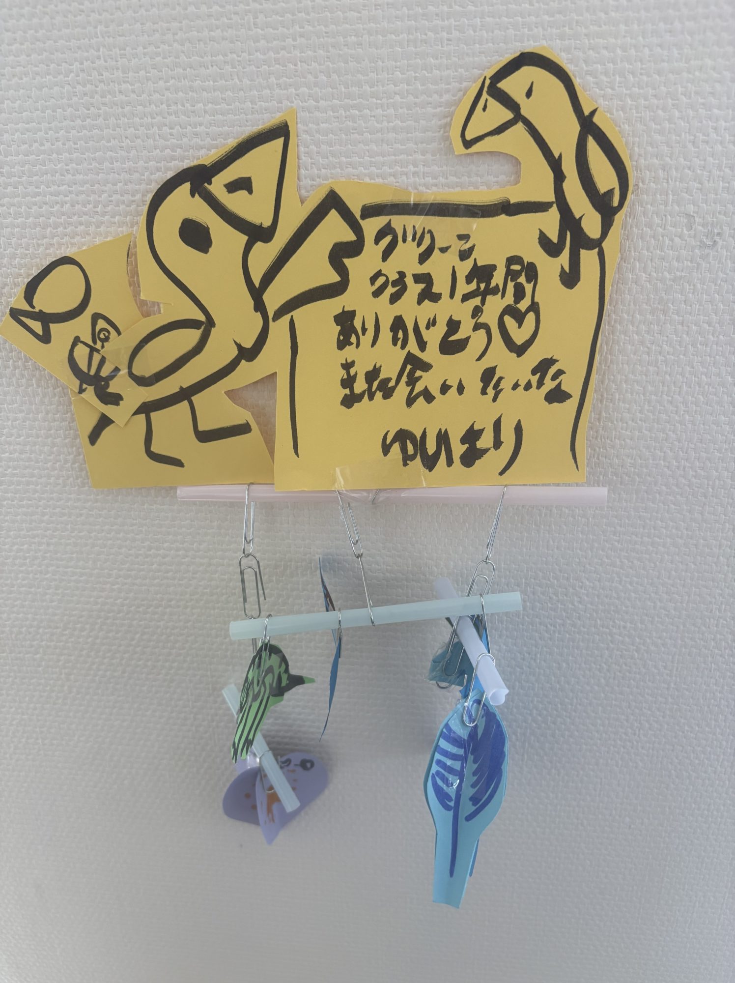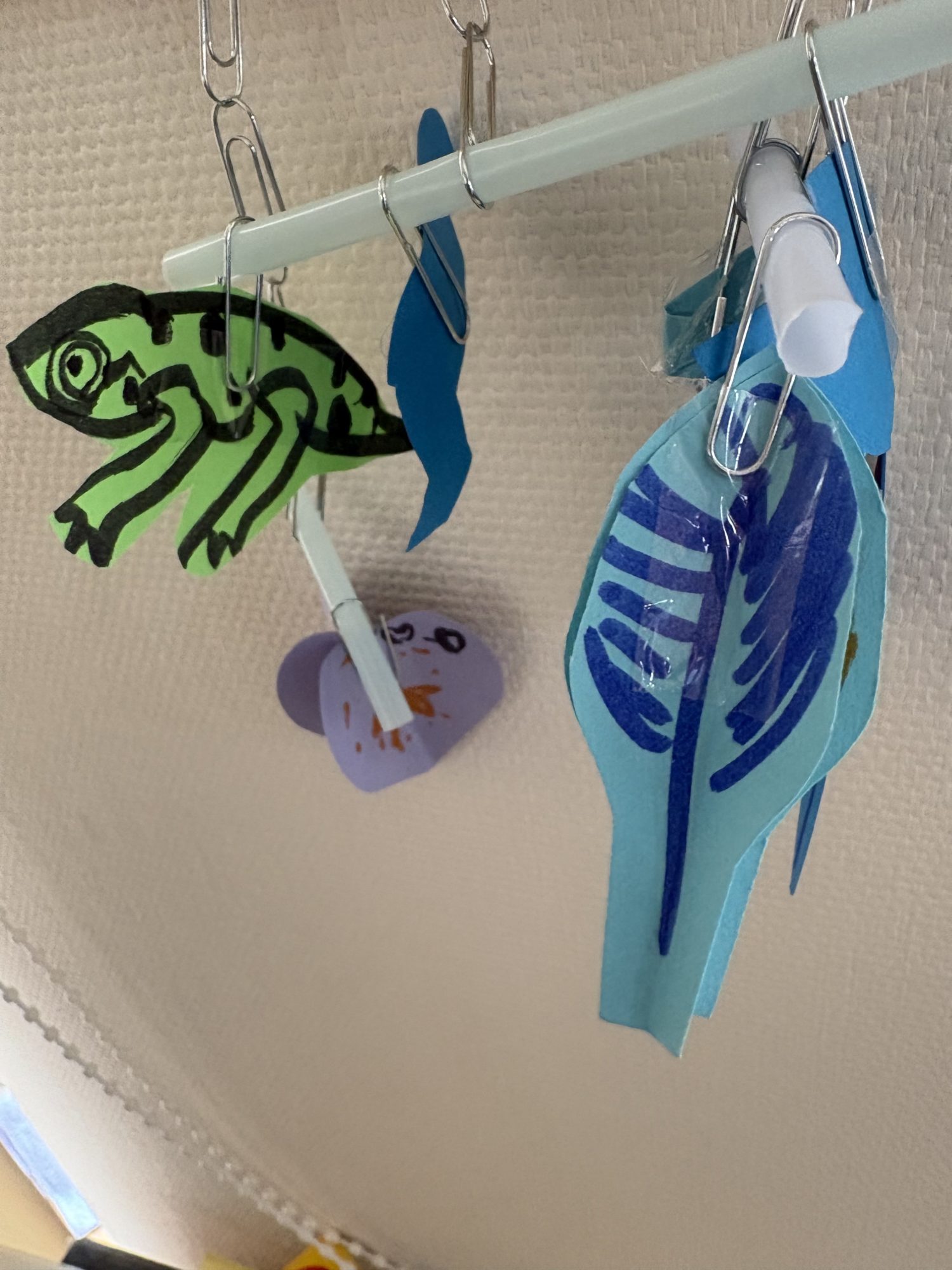 上にあるお手紙の大きな形と、下にぶらさがる小さな生きものたちのバランスがとても心地よいです。メガネのトカゲやハートが、それぞれ違う形や色で軽やかに揺れていて、見ているだけで楽しい気分になりますね。クリップやストローを使ったつなぎ方も工夫されていて、動きが生まれているところに、Yuiさんの発見を感じました。