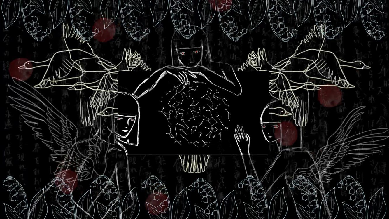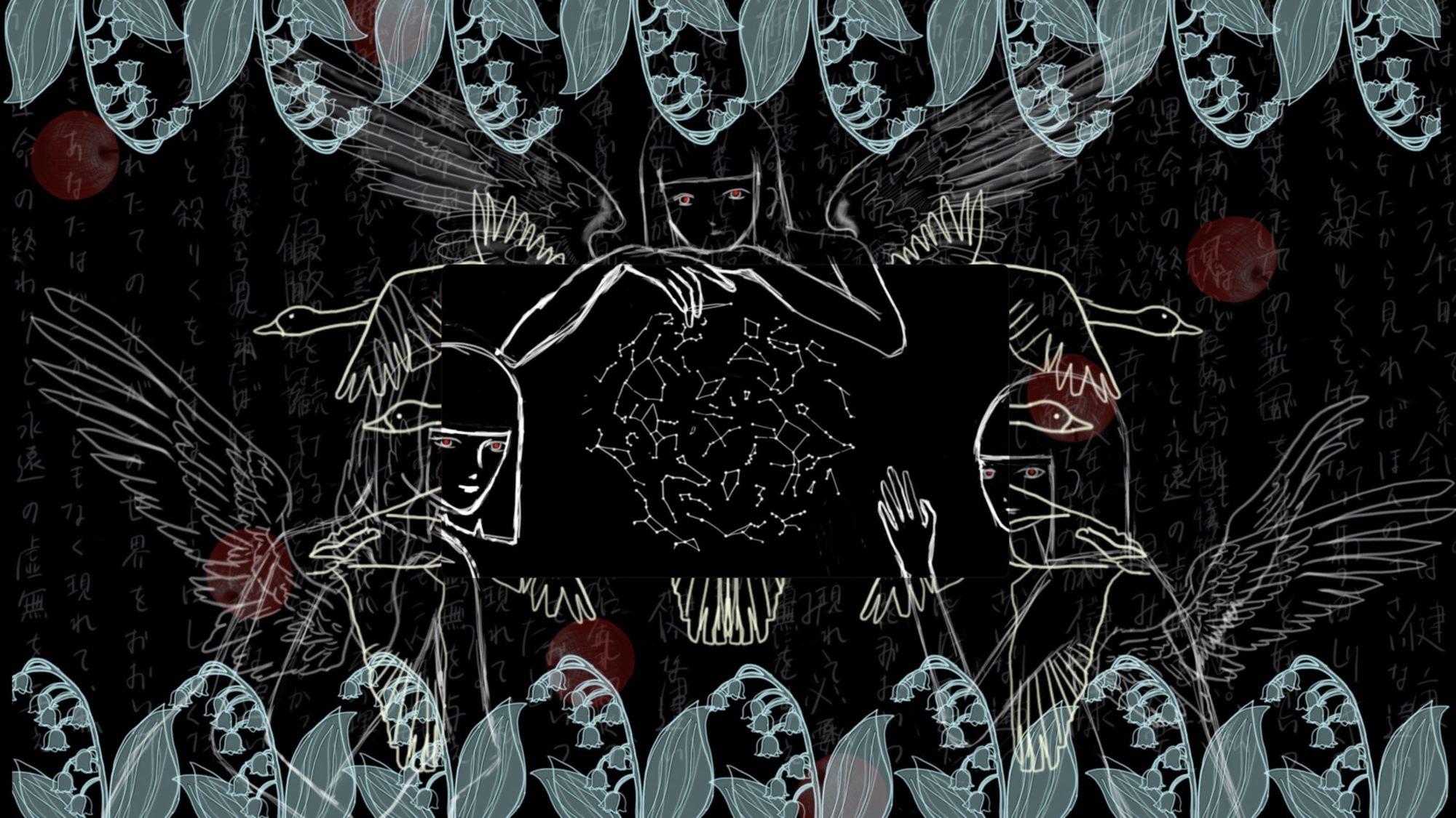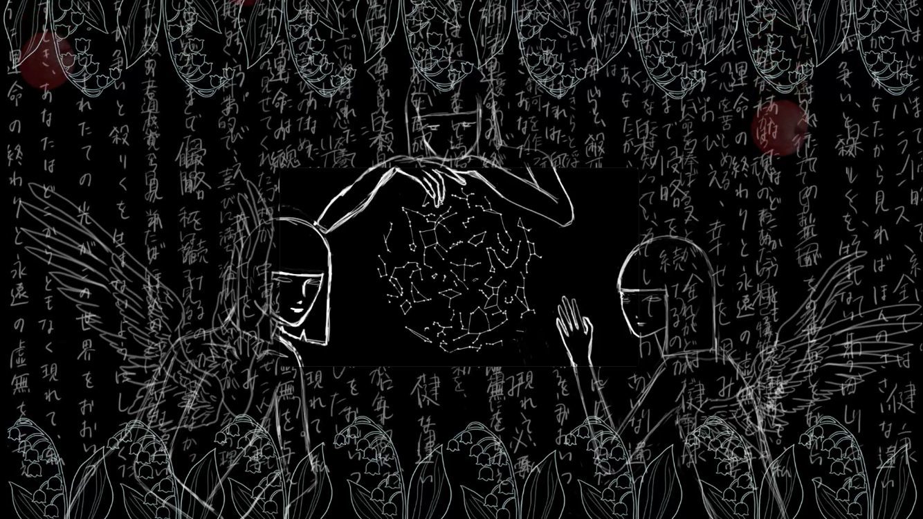 黒い宇宙のような深い画面の中に、白い線で描かれた存在たちが静かに浮かび上がっていて、とても強い“祈り”のような空気を感じました。🌌