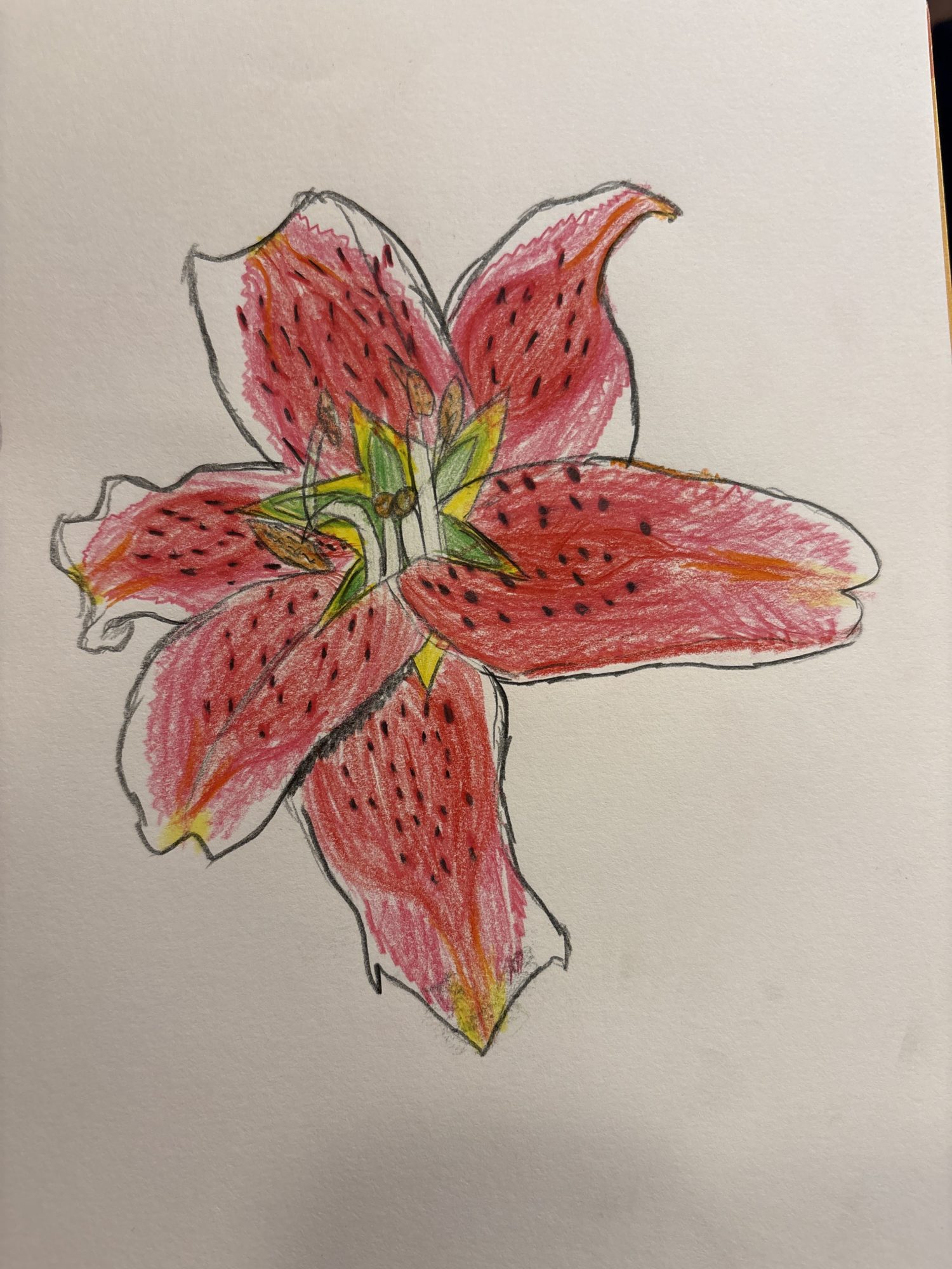 大きく開いたゆりの花びらが画面いっぱいに広がり、赤の中にオレンジや黄色がにじむように重なっていて、色の流れがとても豊かに感じられます。黒い点々や中心の緑の形も丁寧で、じっくり見つめながら描いた時間が伝わってきていいね🌺✨