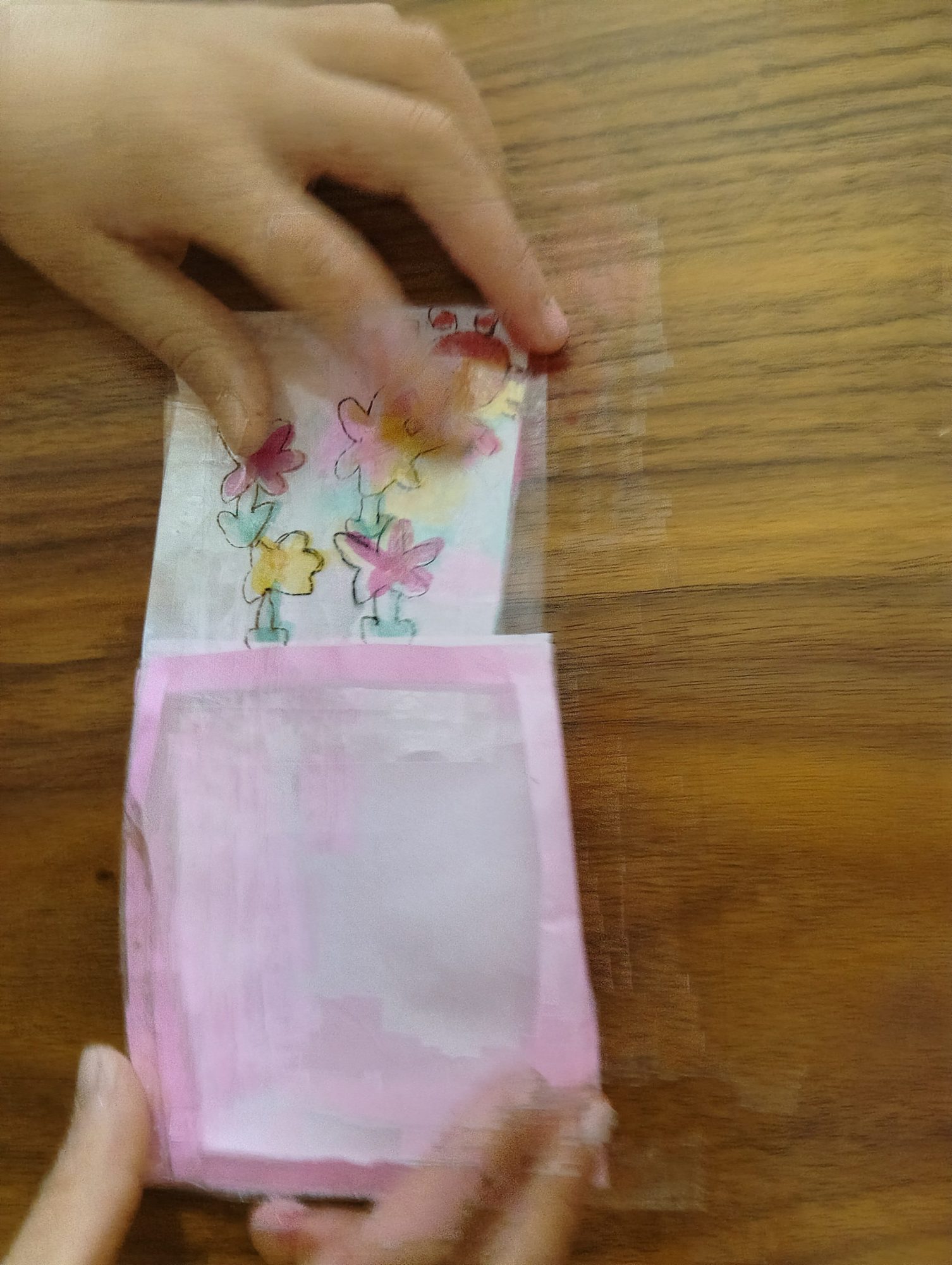 透明なシートの中に、やわらかい色のお花がふわっと浮かんでいて、とても不思議な世界ですね🌸