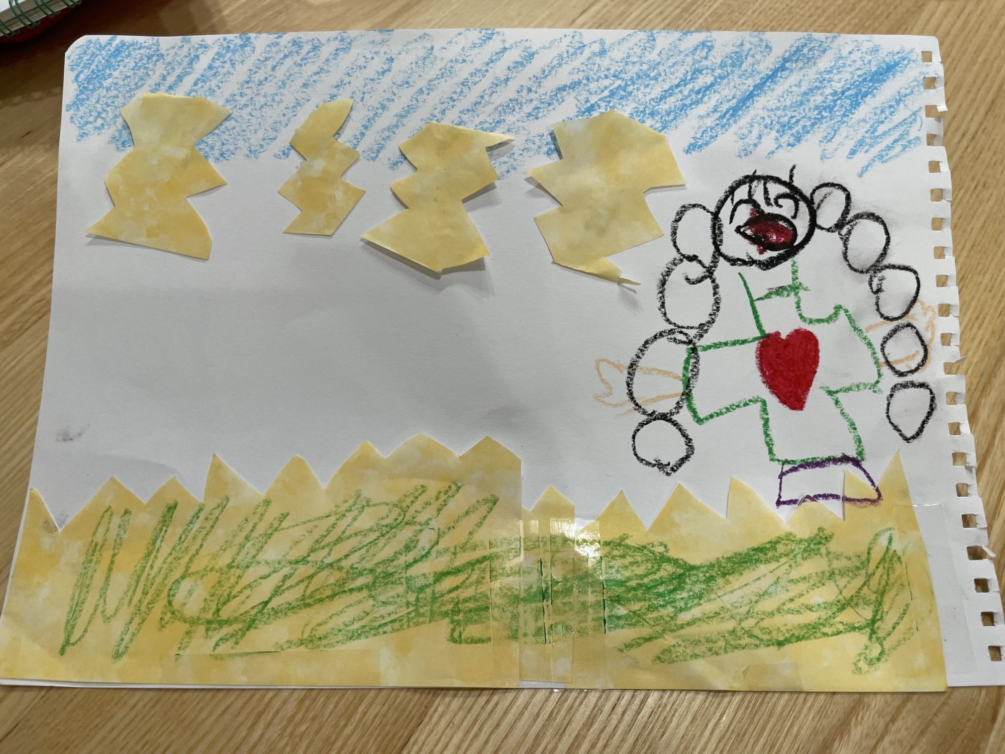 下の緑の線は草のざわざわした音まで聞こえてきそうですし、青いクレヨンの空は大きく広がっていて気持ちがすーっとします。右側の女の子も、風に囲まれてうれしそうに笑っていて、風と仲良しな感じが伝わってきますね😊
