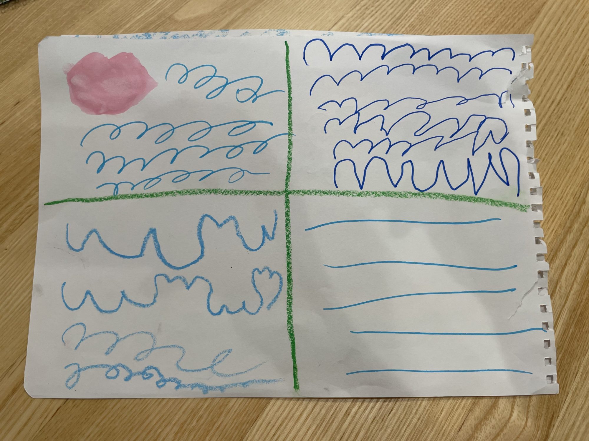 もう一枚の線のページでは、くるくる、ぎざぎざ、なみなみと、いろんな風のちがいをたくさん試していていいね!同じ「風」でも、こんなに表情があるんだと感じました。