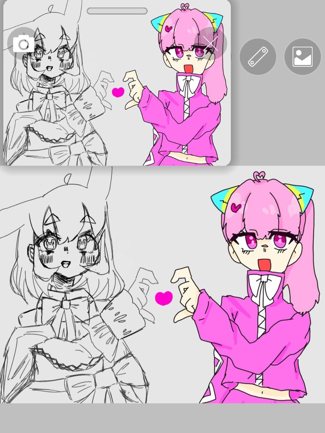 わかめせんせい 先生2026年3月31日 9:03 AM プリン(・∀・/)さん、こんにちは。 左右に並んだ線画と着彩、同じポーズなのに雰囲気がぐっと変わるのがおもしろいですね。 特にピンクの色が画面いっぱいに広がって、キャラクターの明るさや元気さが伝わってきていいね!💗✨ 手でつくったハートの形も、画面の中心でしっかり気持ちをつないでいる感じがして素敵です。 線画のやわらかいタッチと、色がのったあとのはっきりした印象、その違いを楽しみながら進めている様子が伝わってきました😊 服を変えてみたというチャレンジも、「こうしたらどうなるかな?」という発見の時間があっていいね。 私は、ふたりでひとつの世界をつくっているような、やりとりの楽しさを感じました🌈 まぁちゃんさんとは、何を語り合っているんでしょうか? ログインして返信する ↓