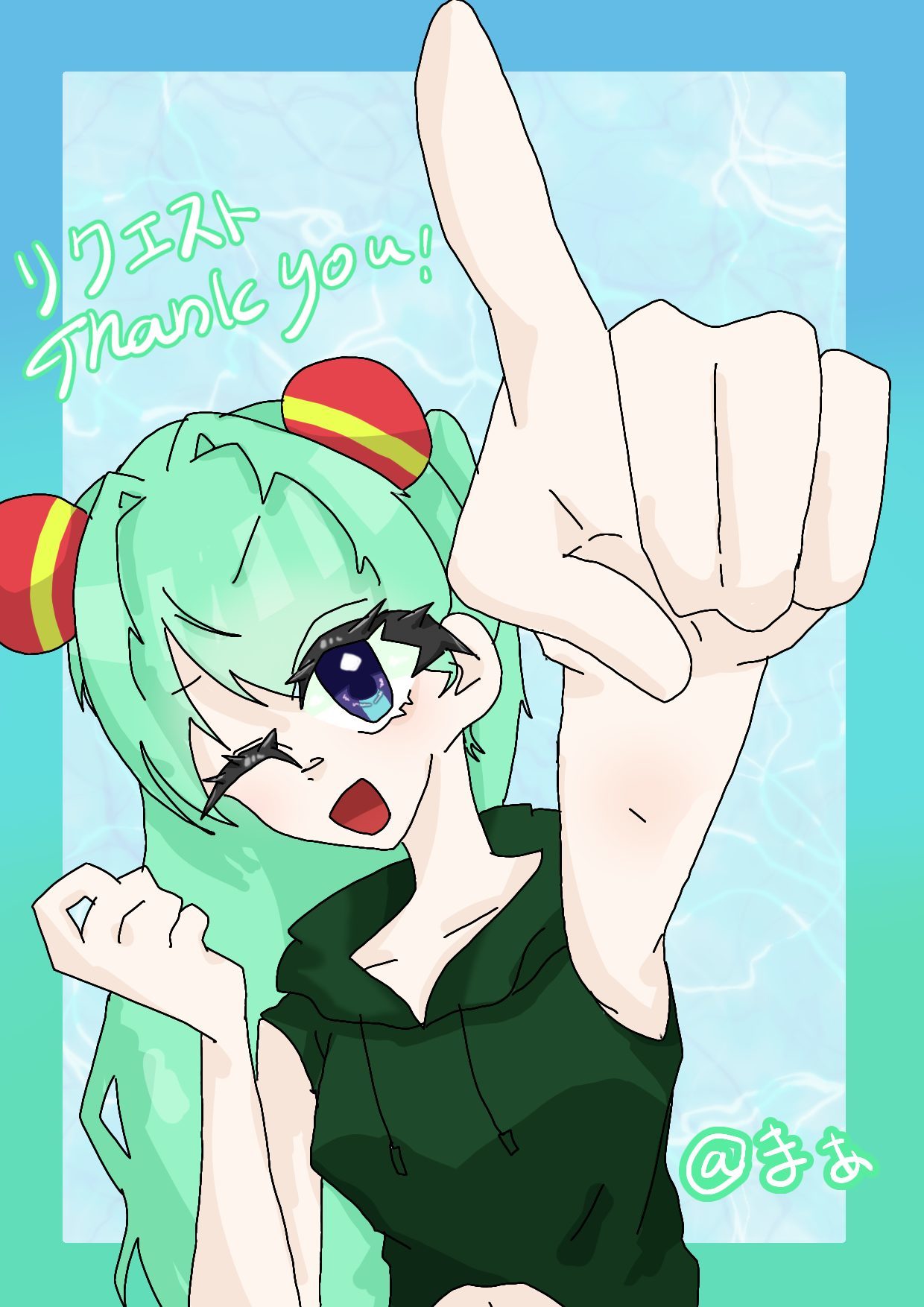 大きく前に伸びた指のポーズがとても印象的で、画面の中から「ありがとう!」の気持ちが飛び出してくるようですね。ミントグリーンの髪と赤いアクセント、そしてやわらかい水色の背景が合わさって、爽やかで元気な空気が広がっていていいね!✨文字の配置も軽やかで、見る人にまっすぐ気持ちが届いてくる感じがしました。