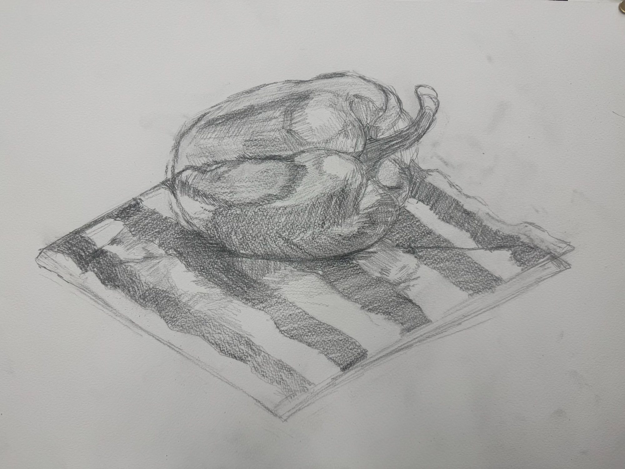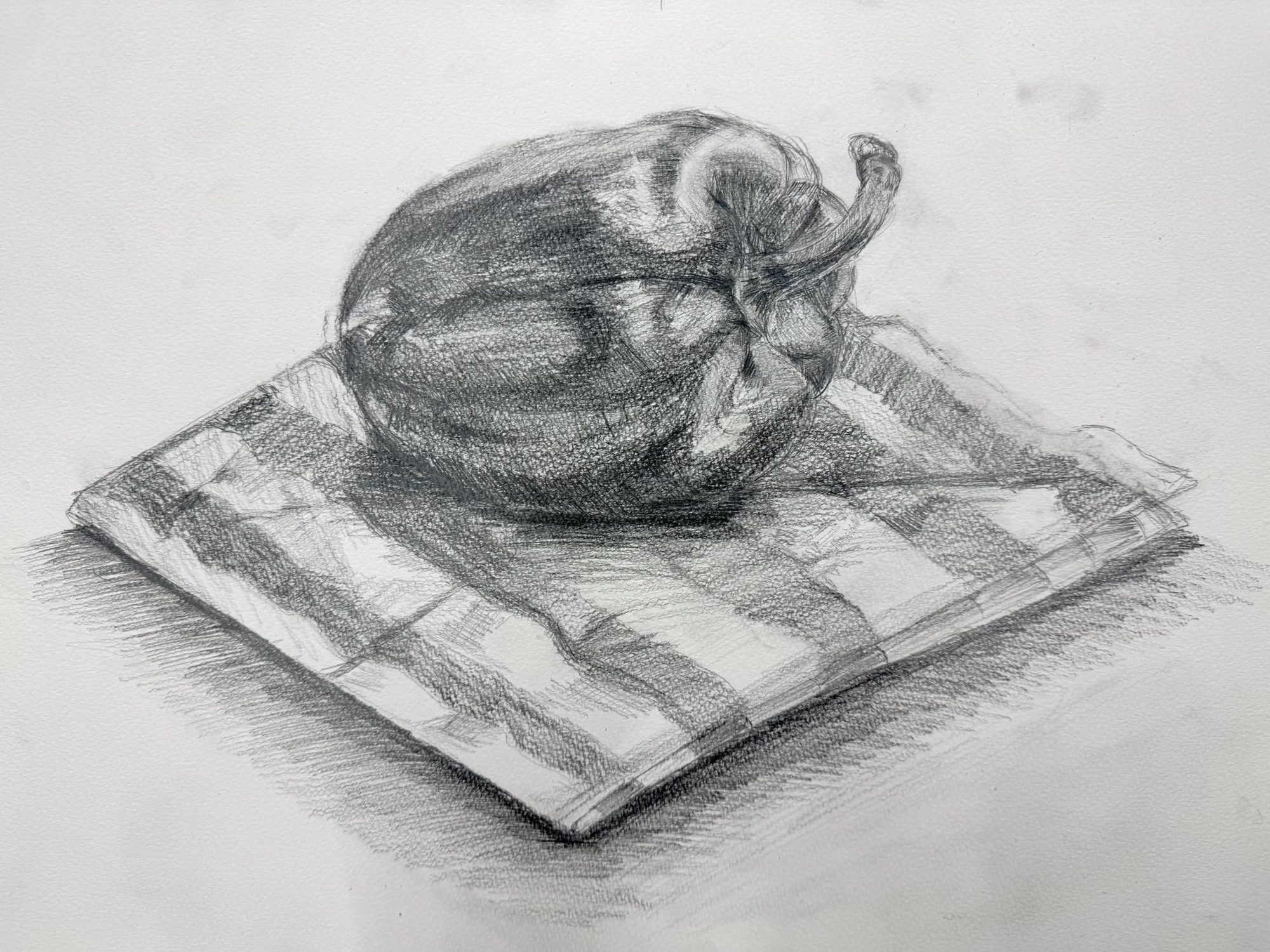 布の柄とピーマンの境界にもっとはっきり黒を入れるとより物体が際立って良いデッサンになると思います!