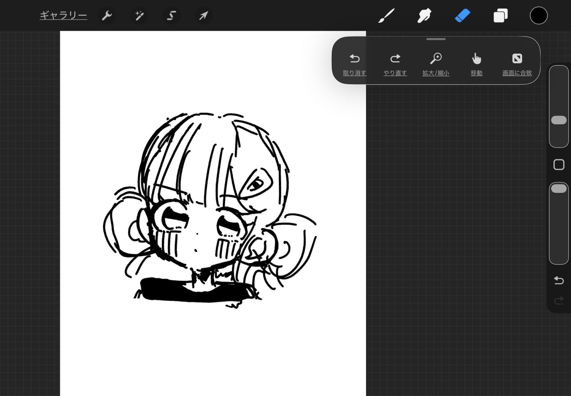 大きな目とほっぺの線がとても印象的で、シンプルな線なのに表情がぐっと伝わってきますね。髪の流れやおだんごの丸みも、リズムよく描かれていていいね!黒の面の入れ方が効いていて、顔がふわっと浮かび上がる感じも面白いです✨