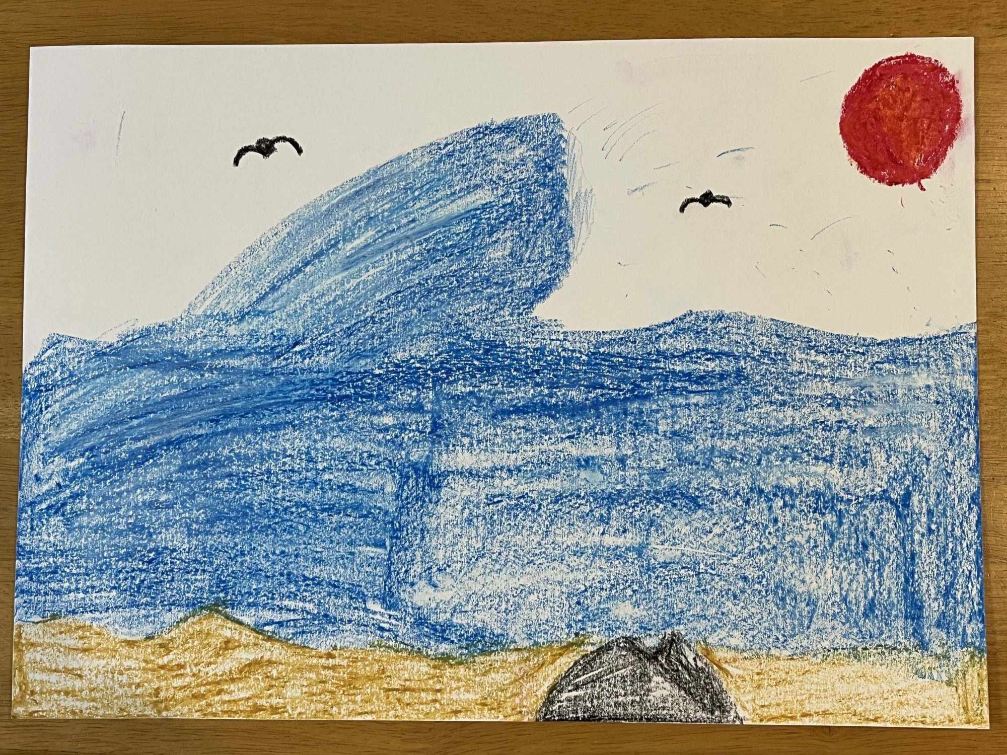海に強い風がふいて、波とカモメが揺れています。海の塗り方を工夫しました。
