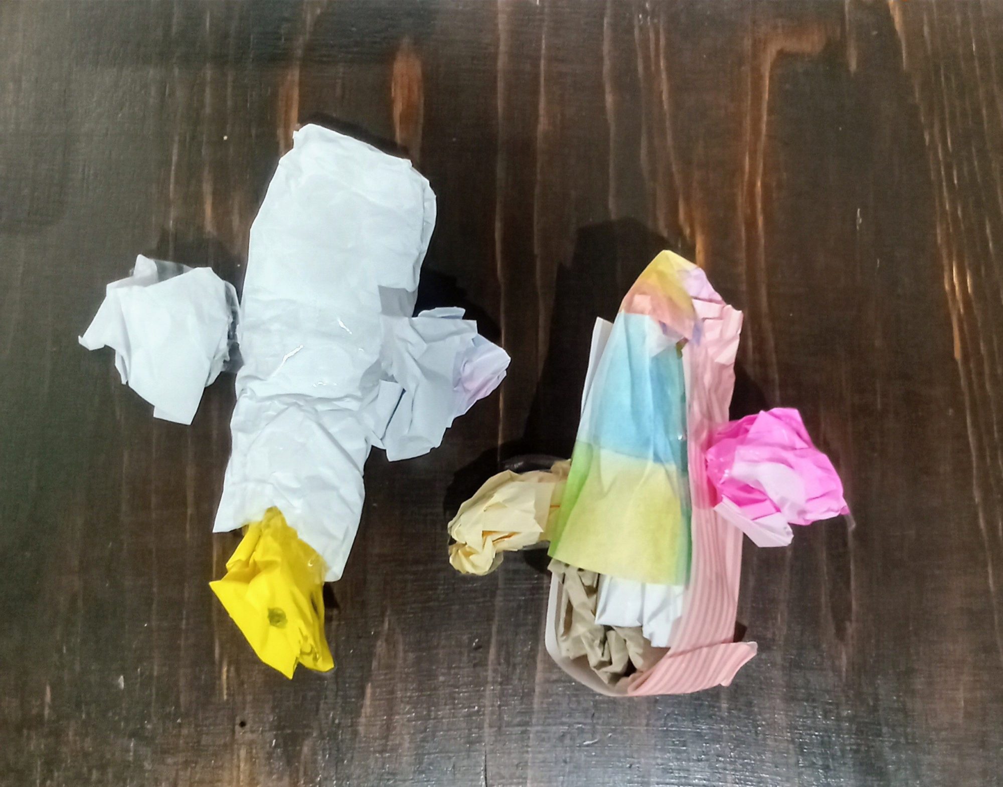 こんにちは!くしゃくしゃにした紙でいろんなものを作ったんだね!