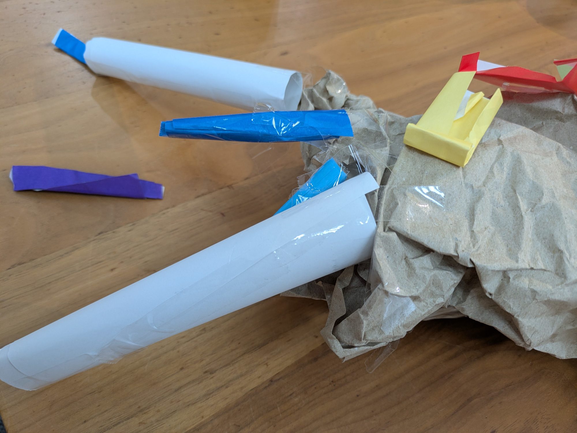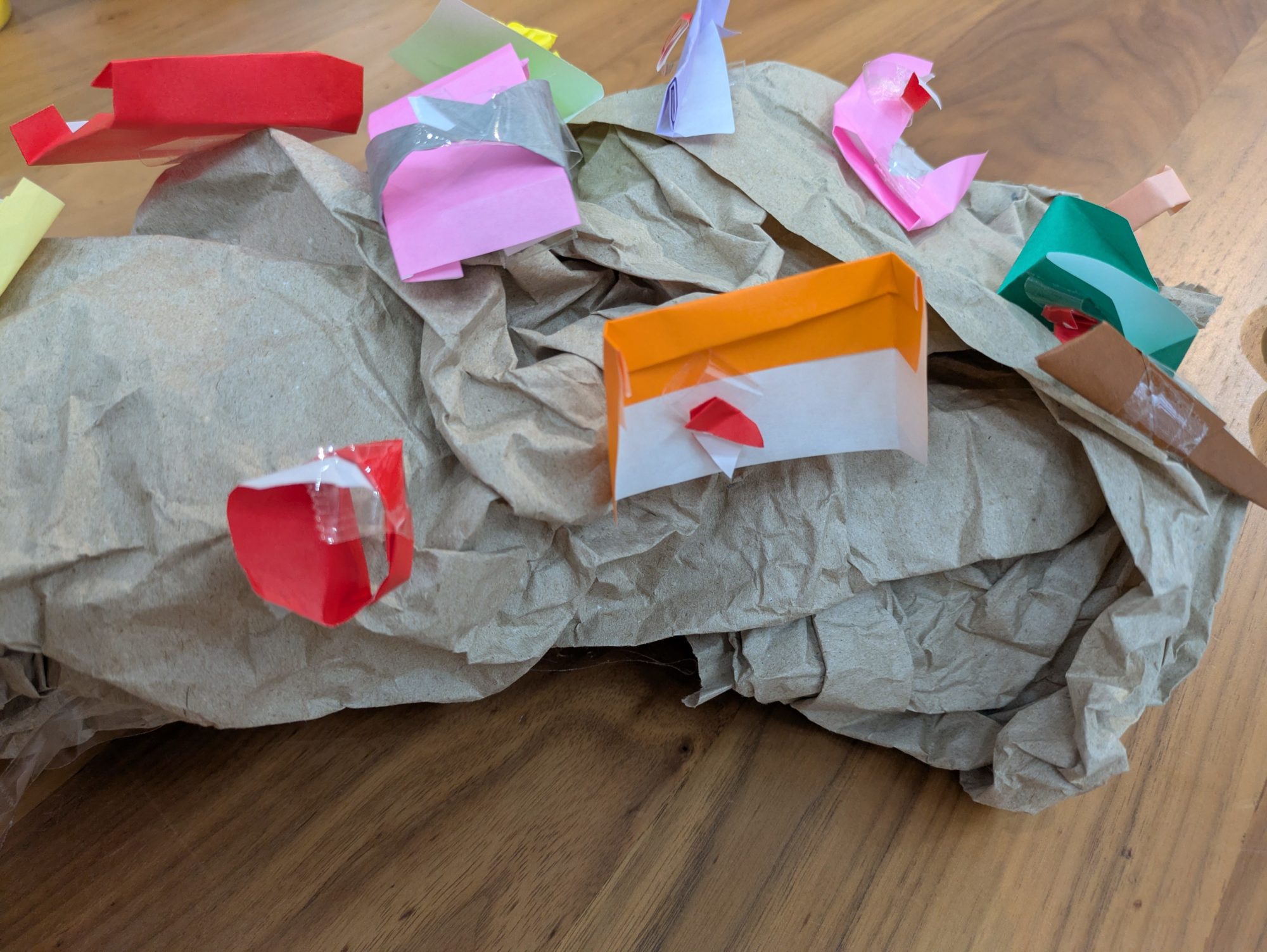 くしゃっとした紙の大きなかたまりが船の形になっていて、その上に赤やピンク、黄色のパーツがちょこんと乗っている様子がとても楽しいですね。透明テープの光り方や、くるっと丸めた形が、動いている感じをつくっていていいね!✨🚢