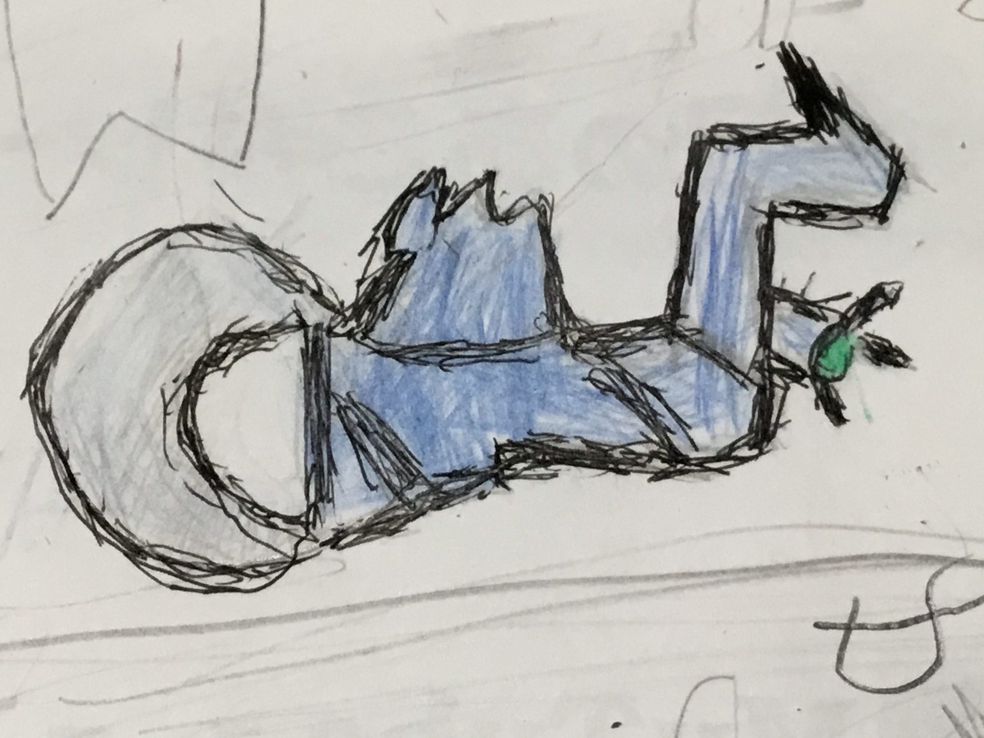 たいちぇいさん、ぐるっと丸まったしっぽから体がのびて、首がぐいっと立ち上がる形がとても力強いですね。折り紙のカクカクした面の感じが線でよく表れていて、立体を見ながら描いた様子が伝わってきます。青の色も体のボリュームを感じさせてくれていいね!🐉✨