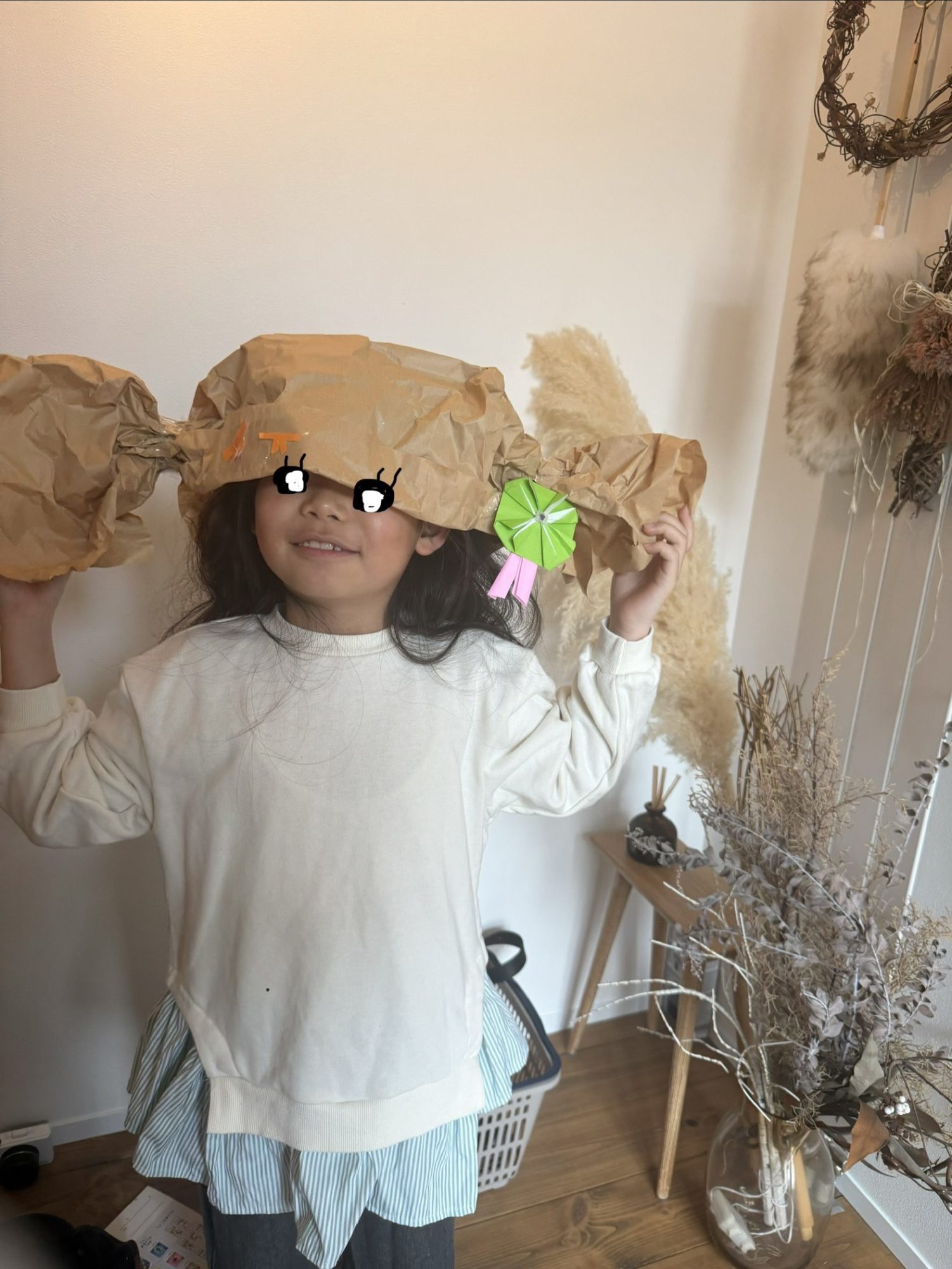 大きくふくらんだ紙のぼうしが、まるでキャンディみたいに左右に広がっていて、とても楽しくていいね🍬✨