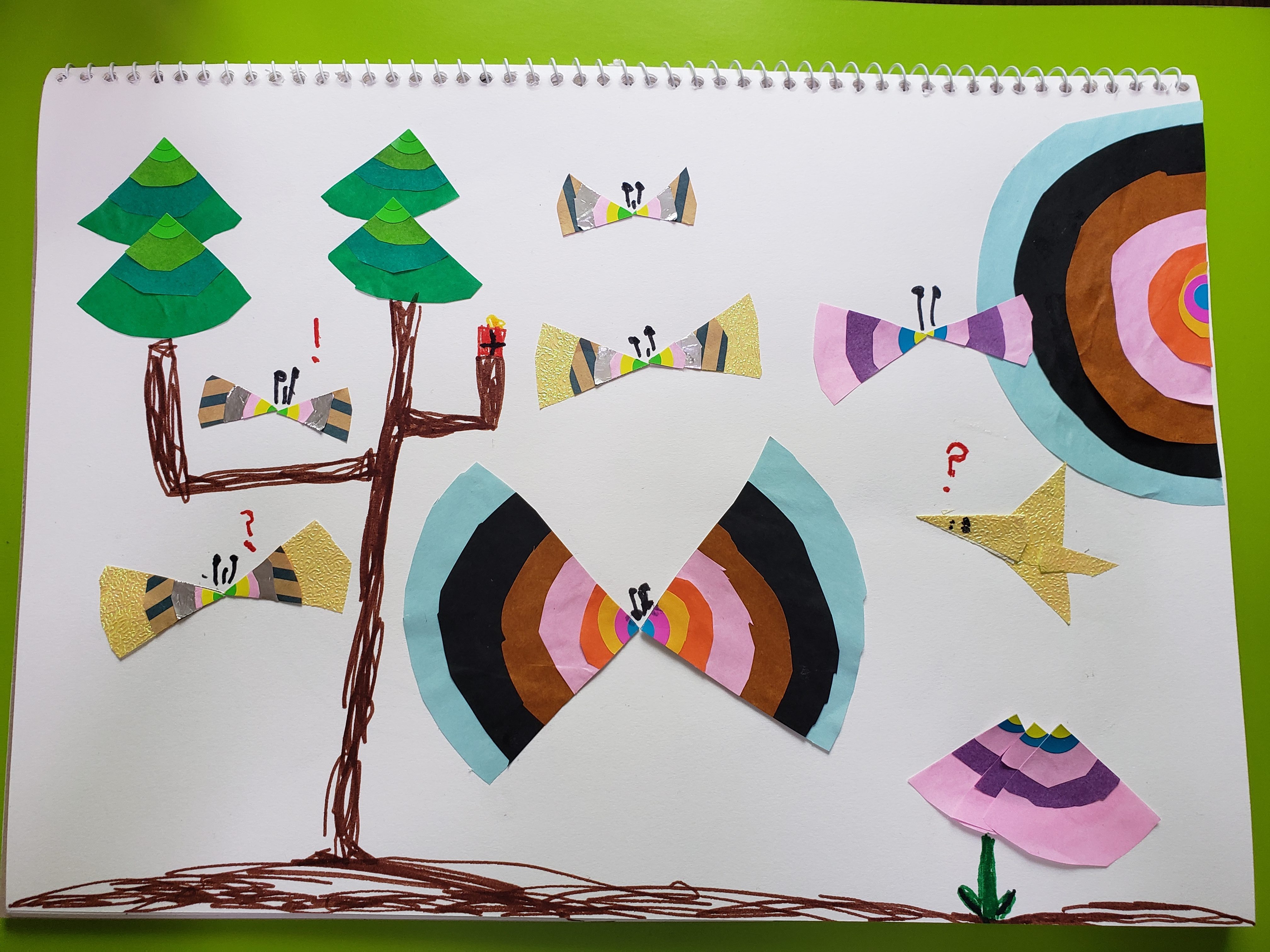 きのうえには宝ものがあるのかな? ちょうちょさんがみんなで探して、ひとりだけ見つけた! ってなっているように見えます〜