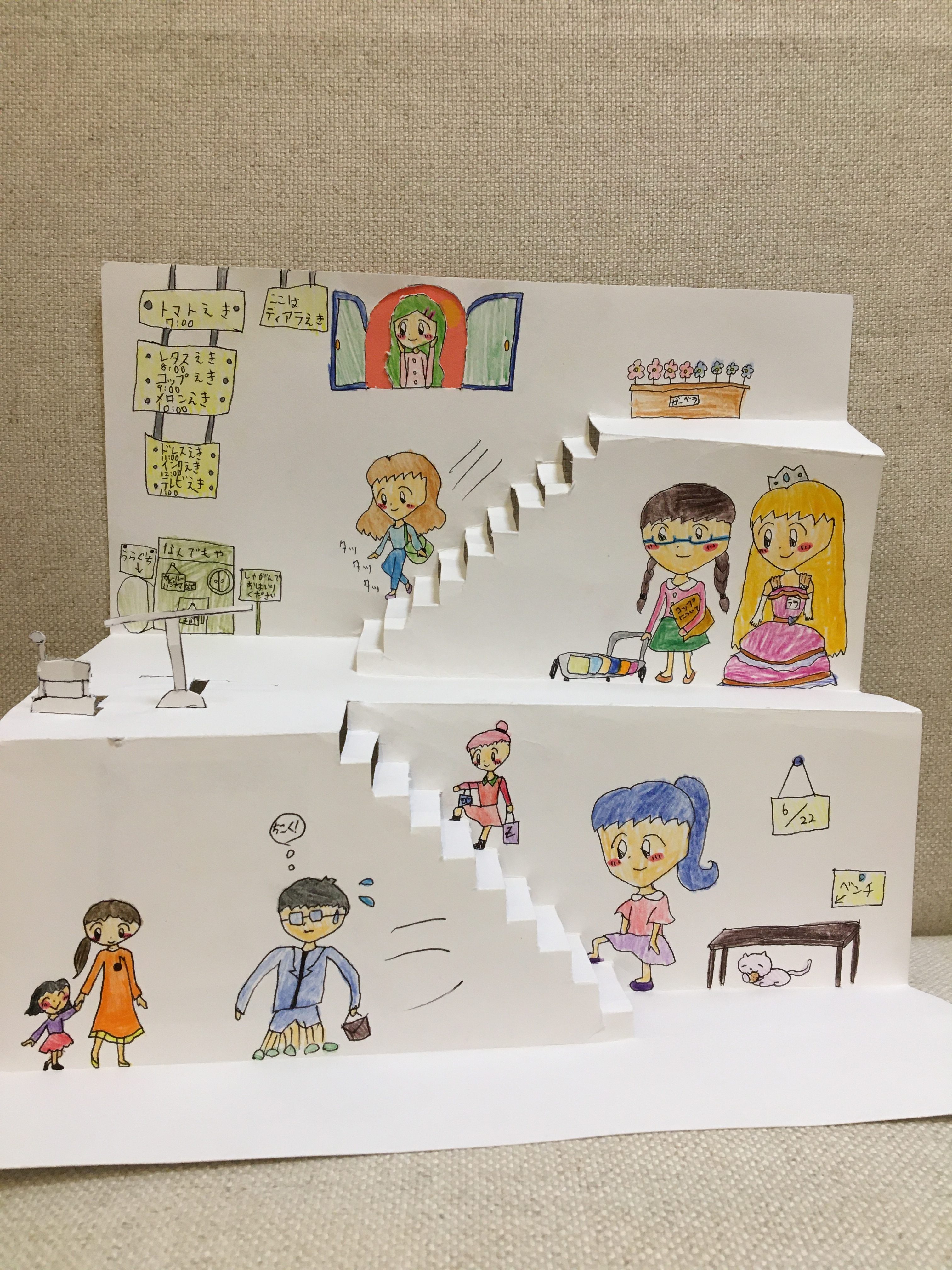 テーブルと椅子を、立ち上げて作っているところが立体の階段の作品をさらに楽しくしていますね!!!