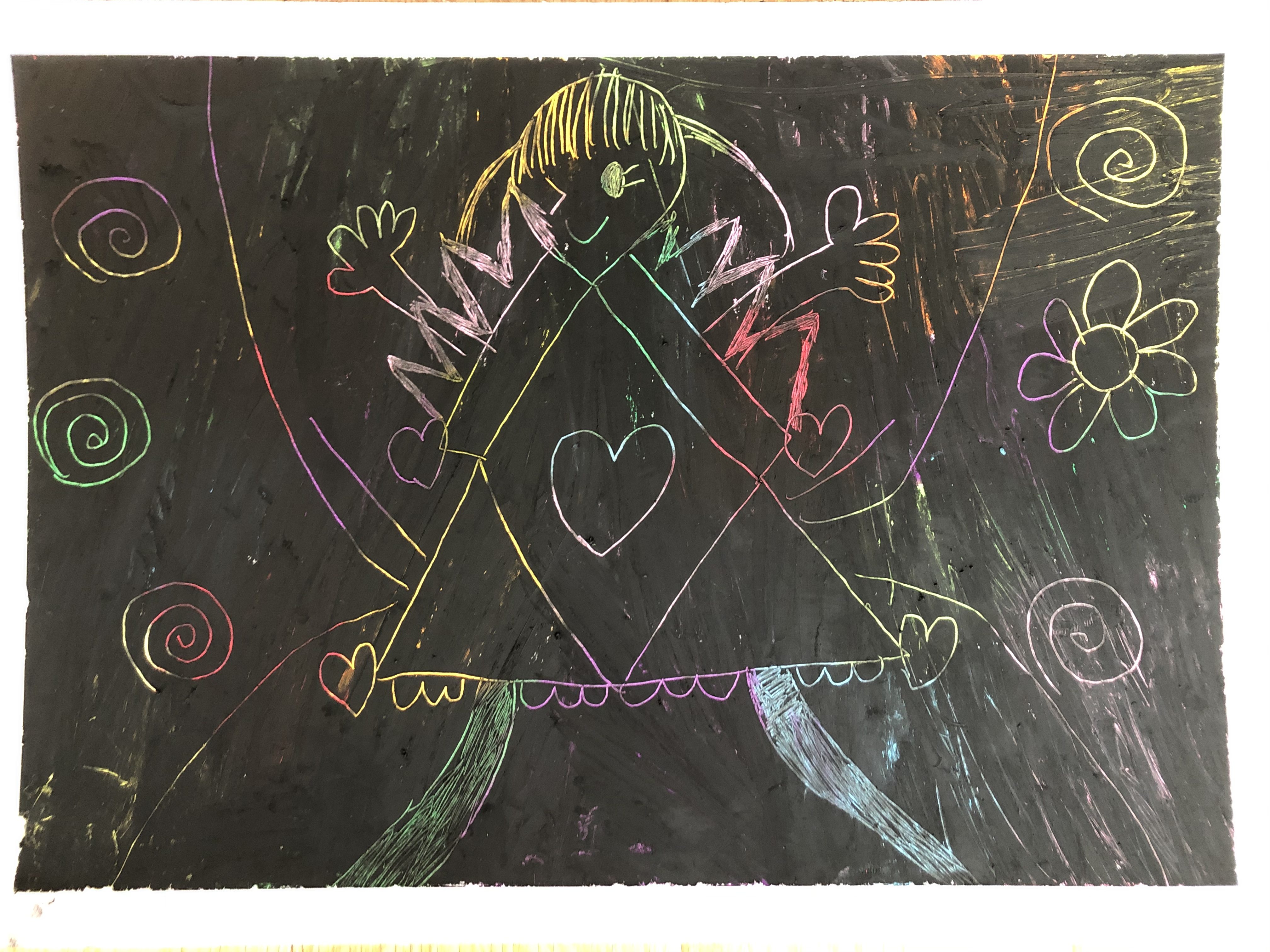 かわいい色のワンピースを描きました。 色塗りがたいへんでしたが、削るとカラフルな色が出てきて、楽しかったです!