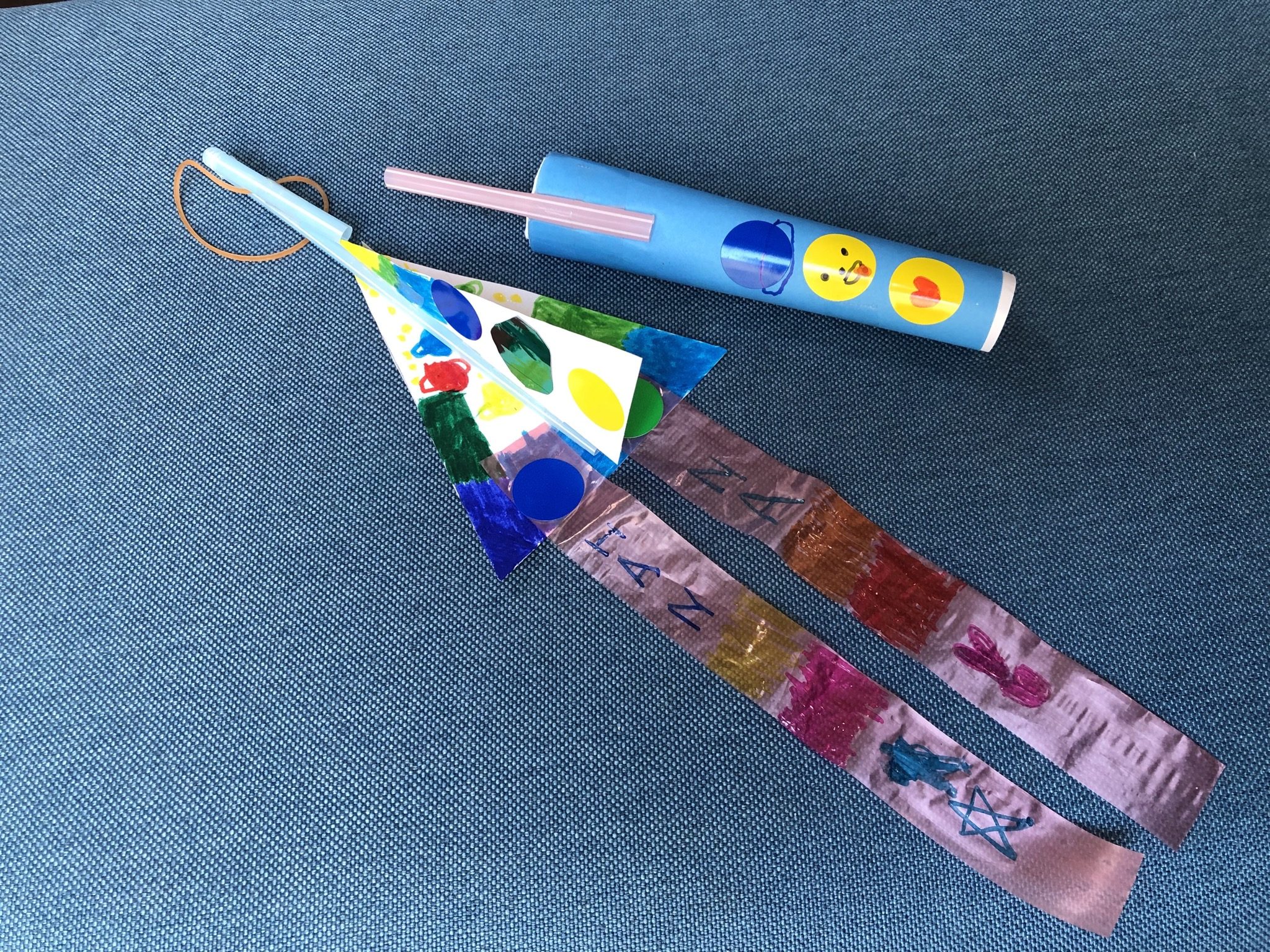 丸シールのかたちまで生かして、惑星をたくさんデザインしたね!世界に一つだけのロケットだね!