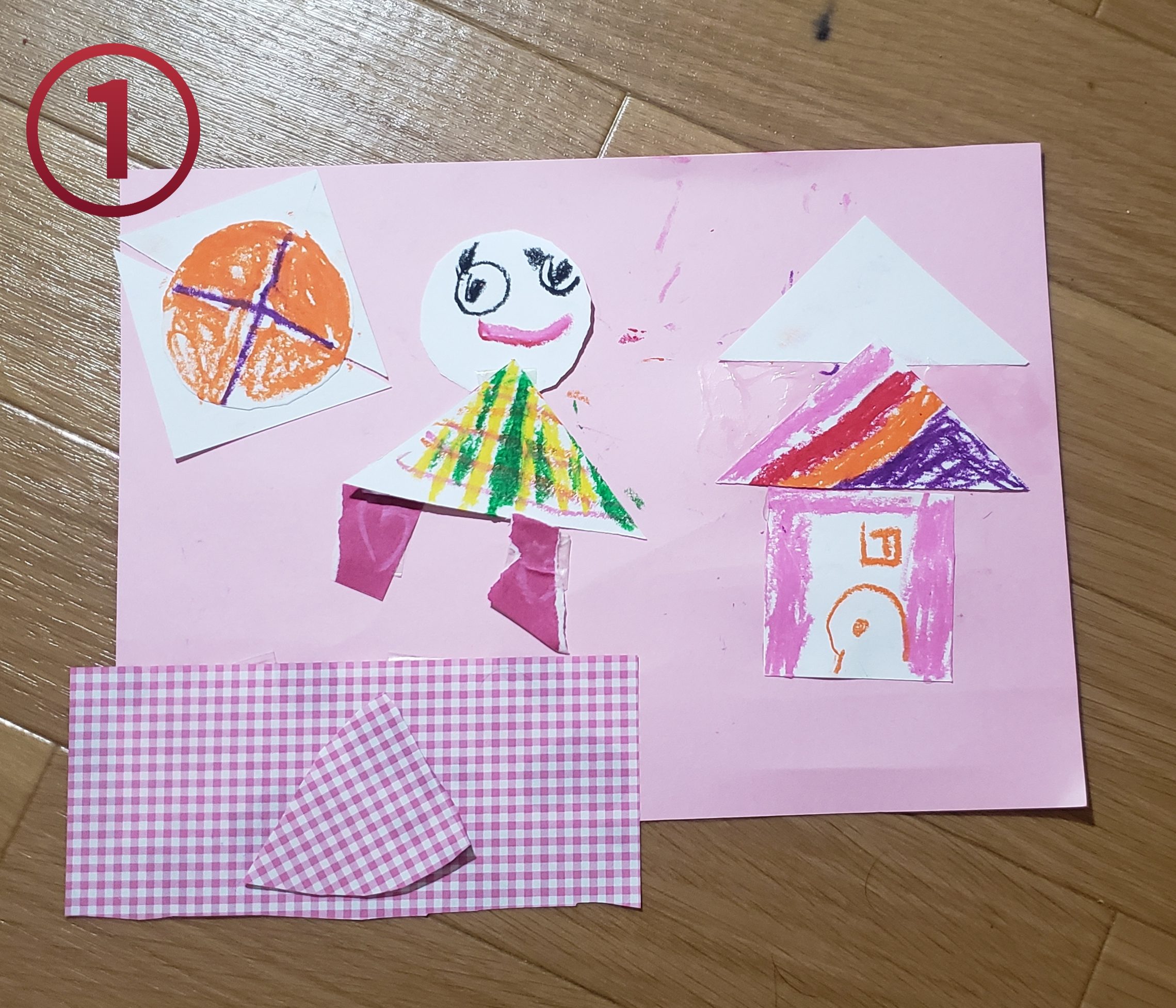 お洋服がチエック柄で、すごくかわいいし、三角屋根のお家は、レインボーでステキだね!!