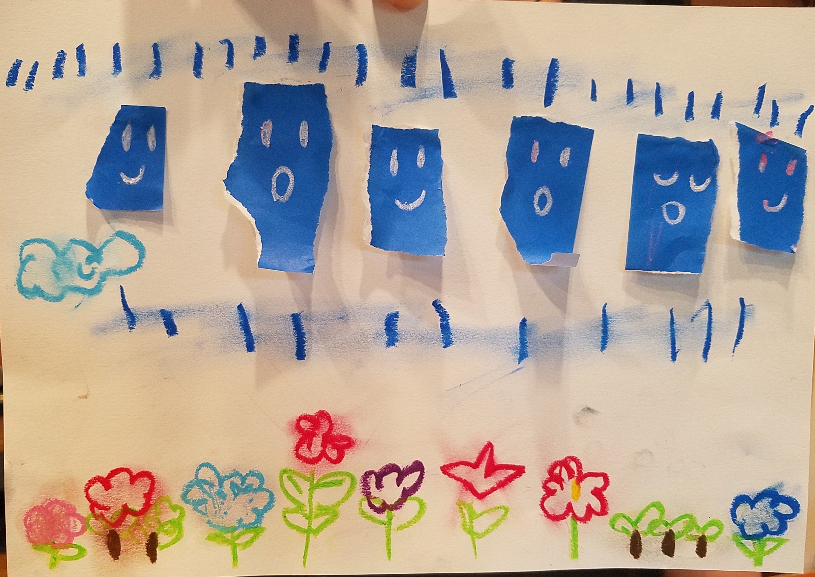 クレヨンをこすってつくるひょうげんが、フワフワ〜〜っとして、雨の日のふんいきにばっちりですね!