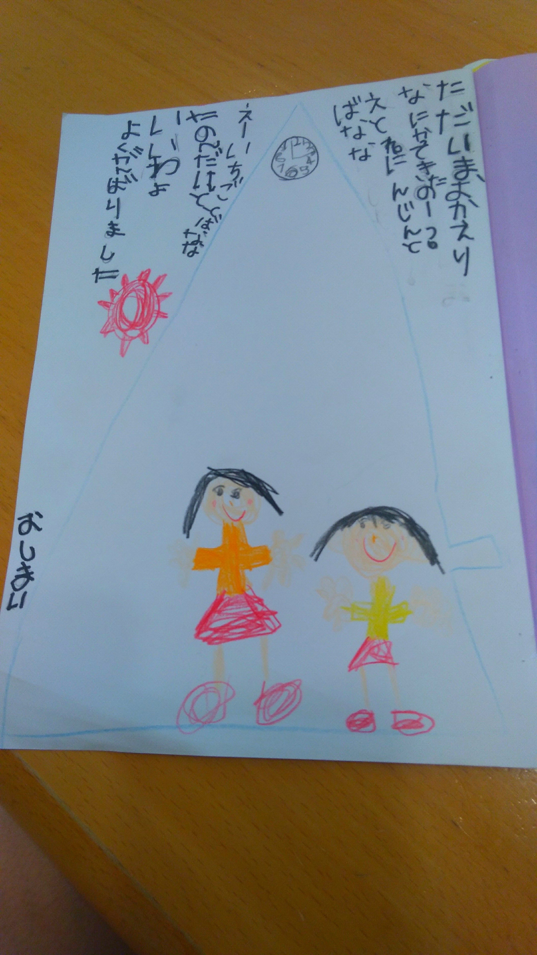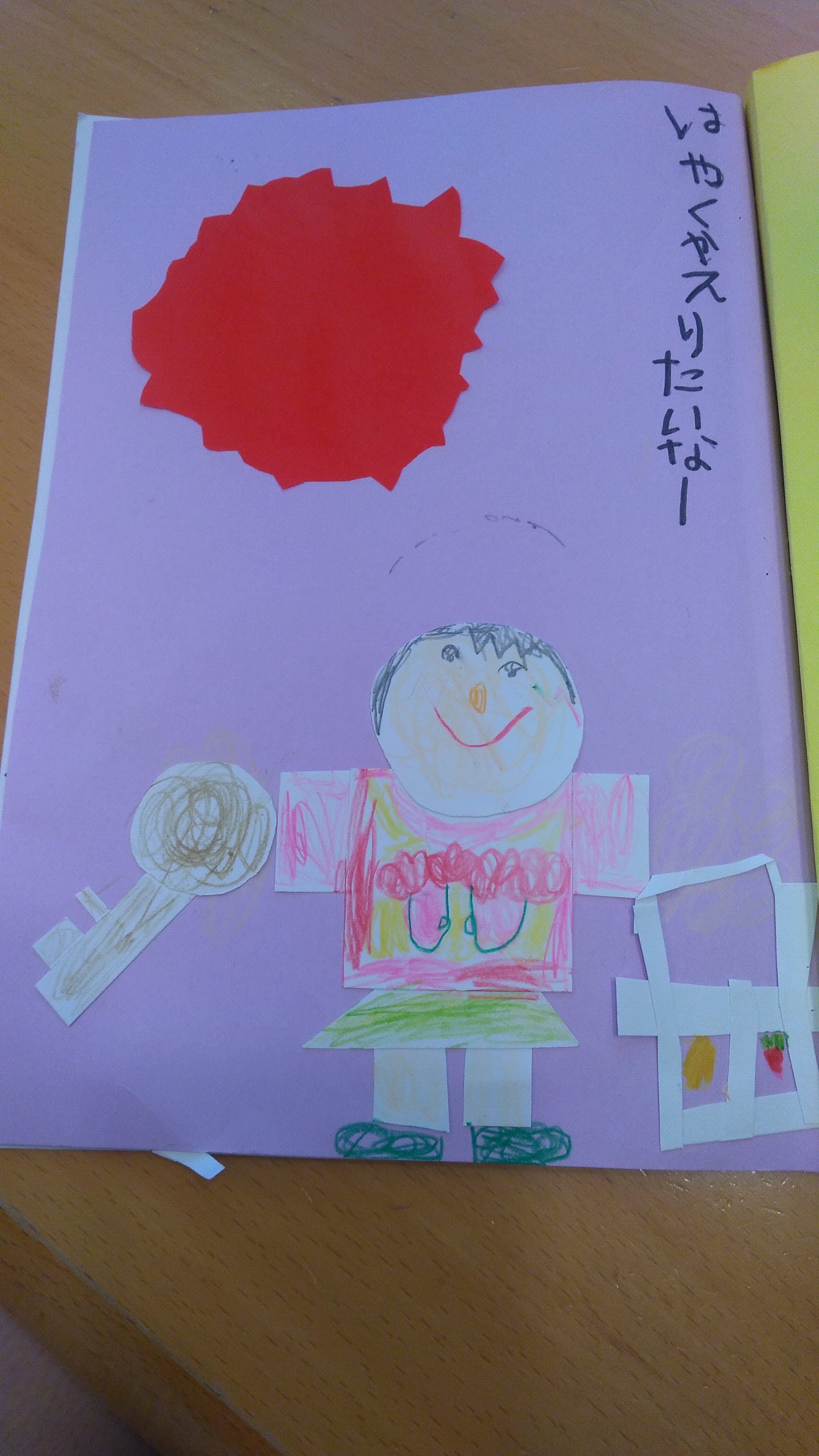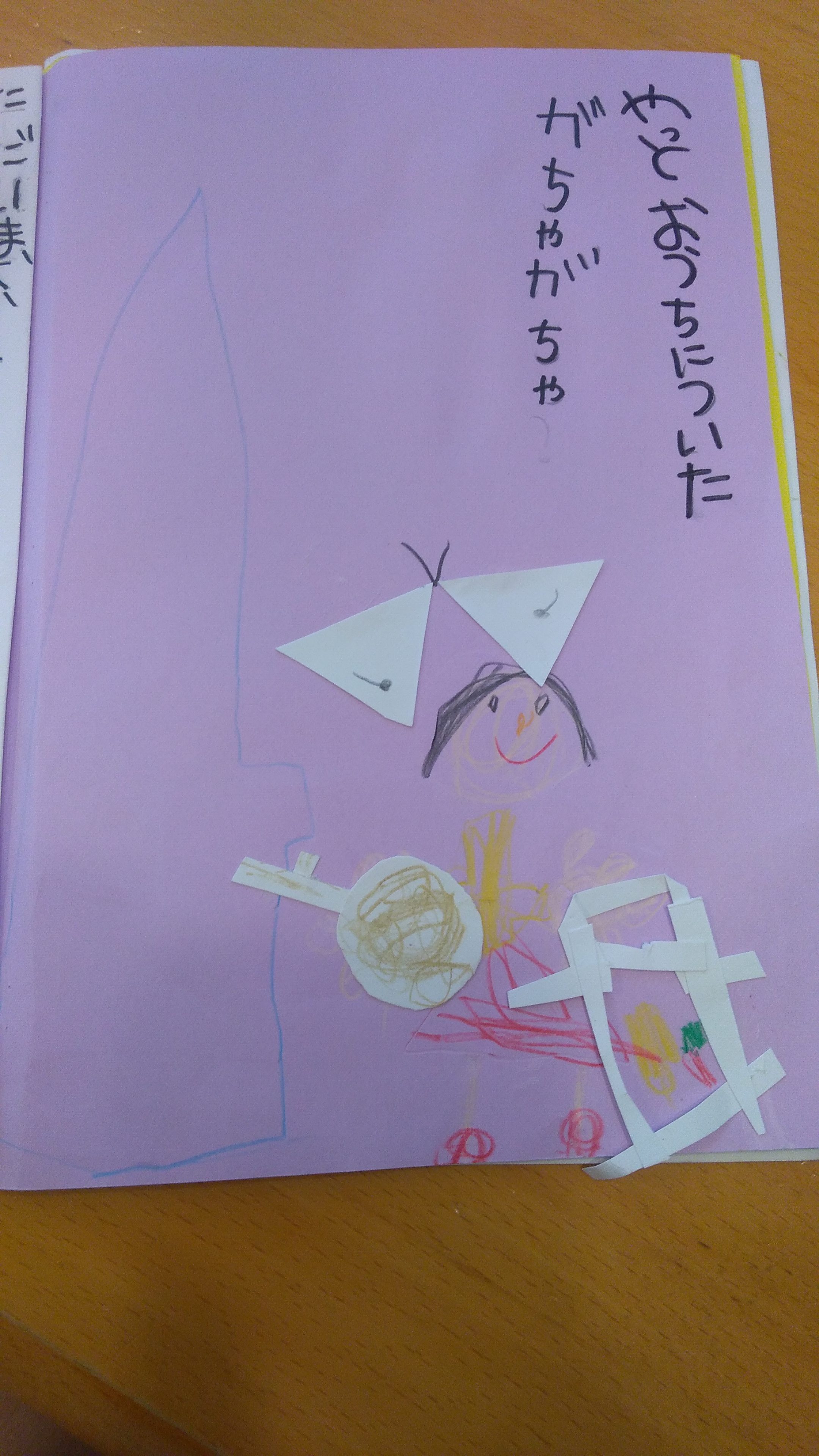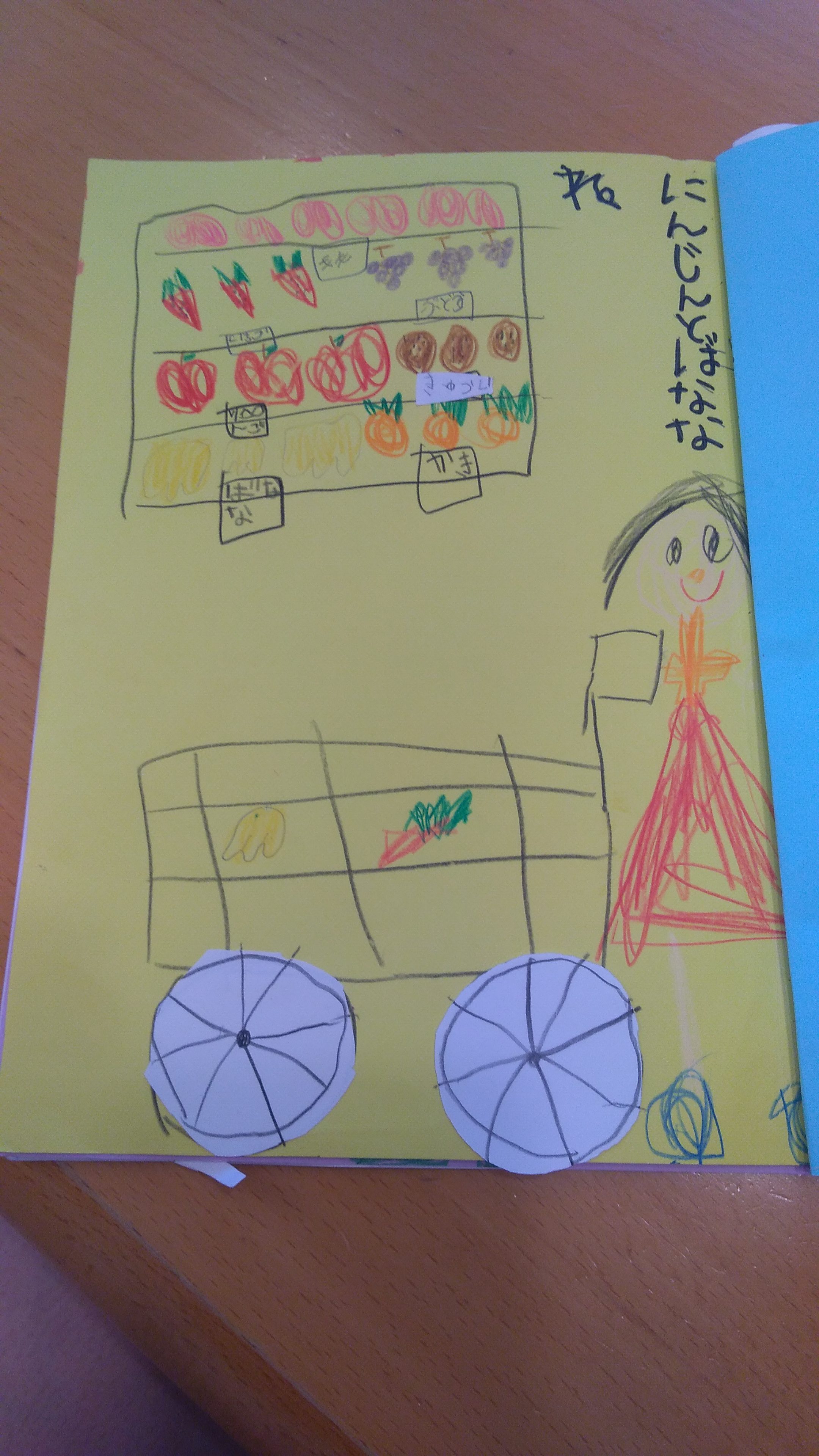 子どもってよく見てますよね。スーパーの野菜が並べてある棚、買い物袋を下げながら鍵をガチャガチャする仕草。そして見たものをこうして作品に起こしす行為は子どもを安心させます。