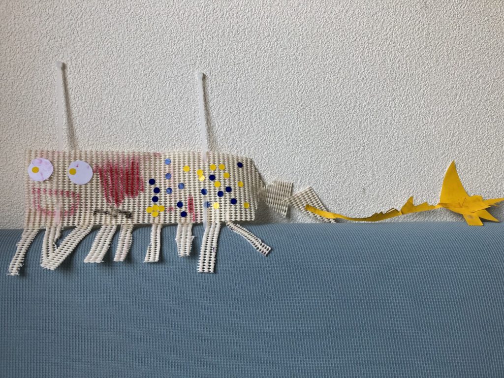 しっぽはすべり止めシートをきってつなげたり、折り紙をきってつなげてくれたんだね。