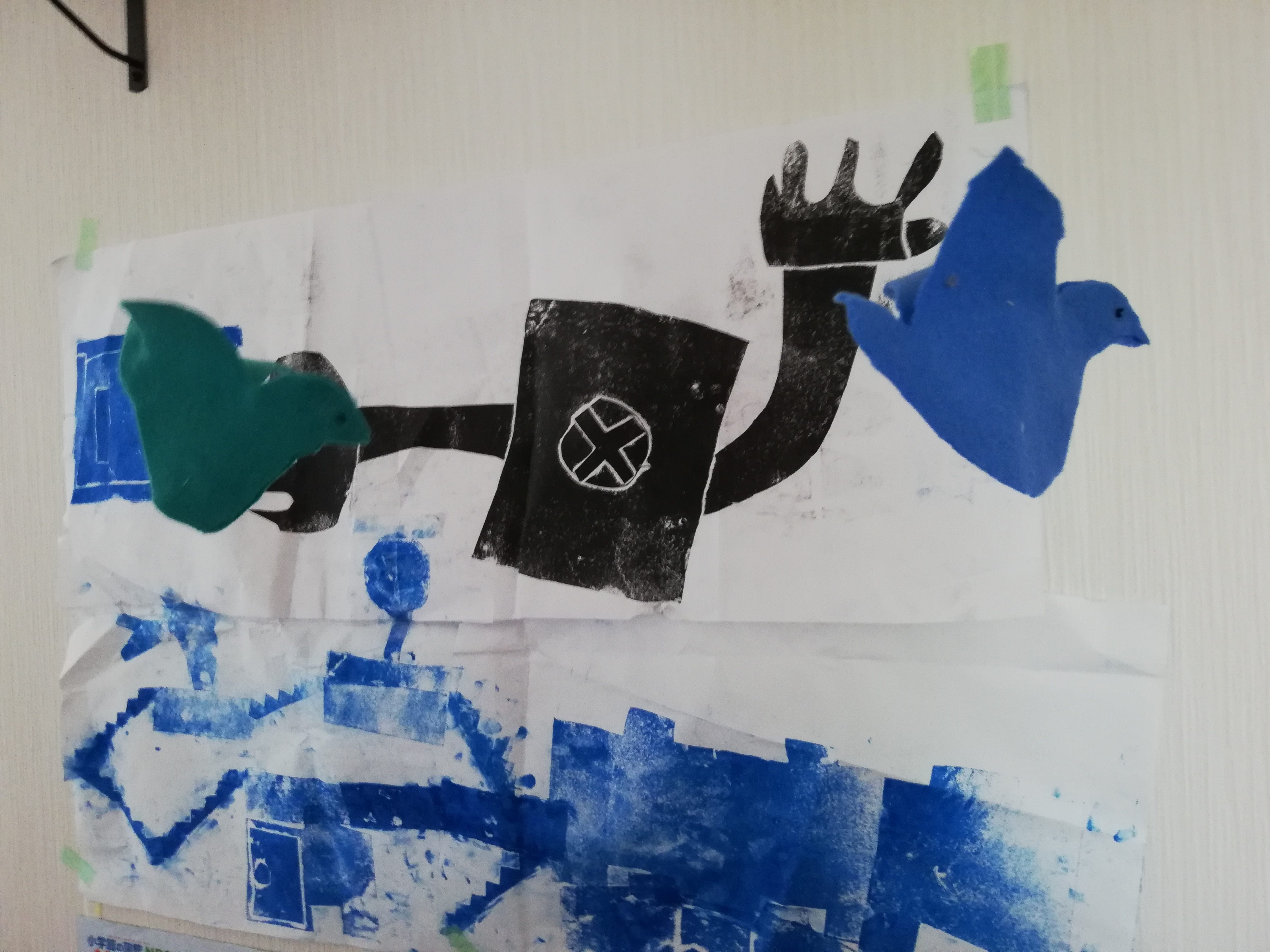 背景に版画の作品があったのですね! 鳥と版画の作品がコレボレーションしているみたいで、なんだかおもしろい作品になっているね☆