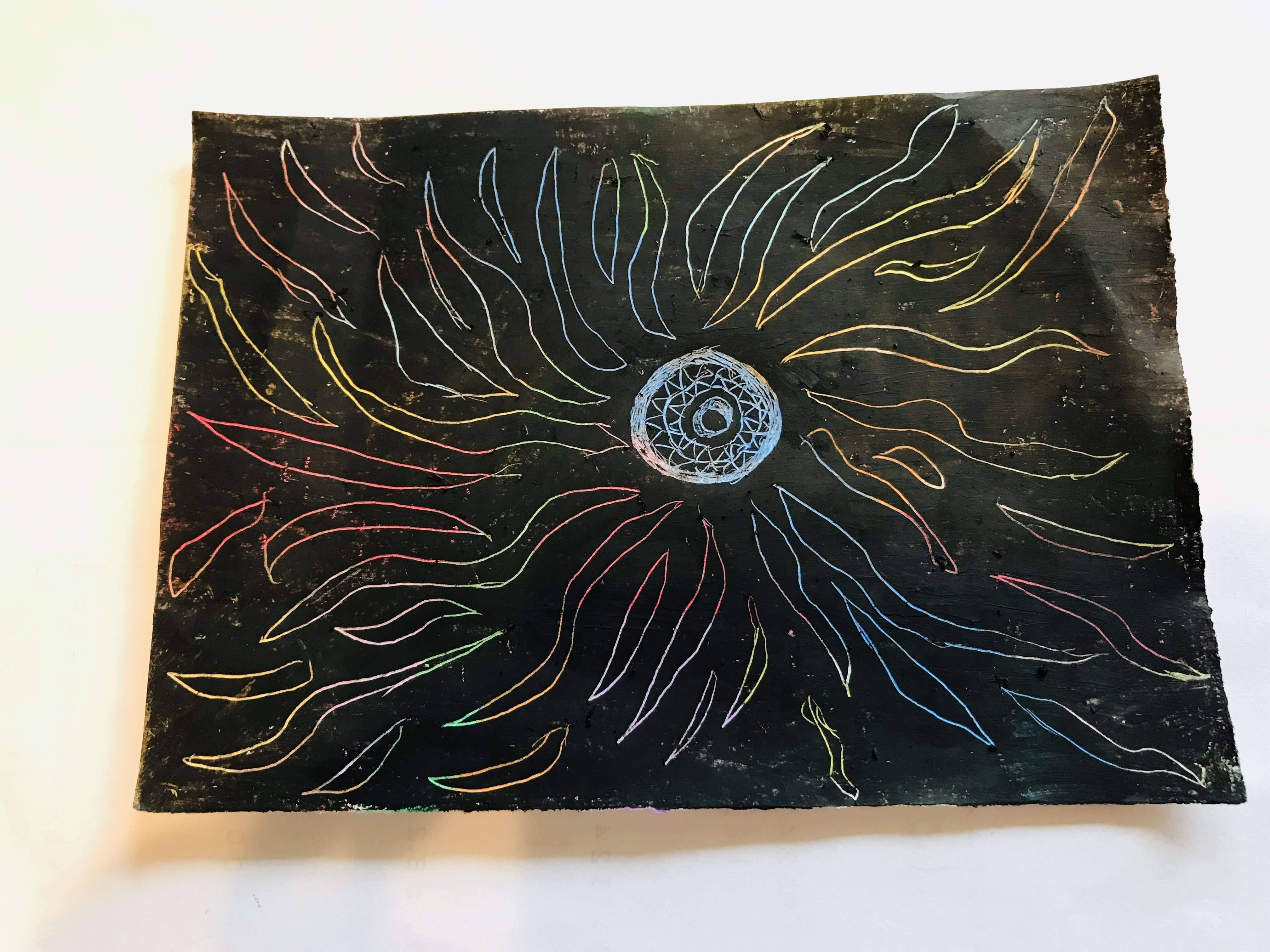 カラフルなクレヨンを一面に塗って、上から黒いクレヨンを塗りました。爪楊枝で黒いクレヨンを削ったら太陽が出来ました。
