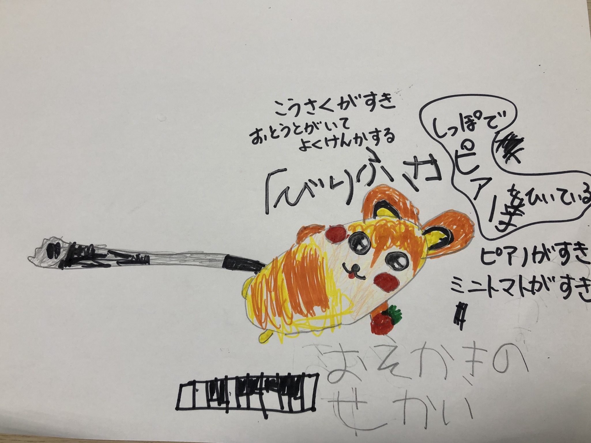長いしっぽでピアノを弾くのが得意なんだね♪発想がおもしろいね~~!
