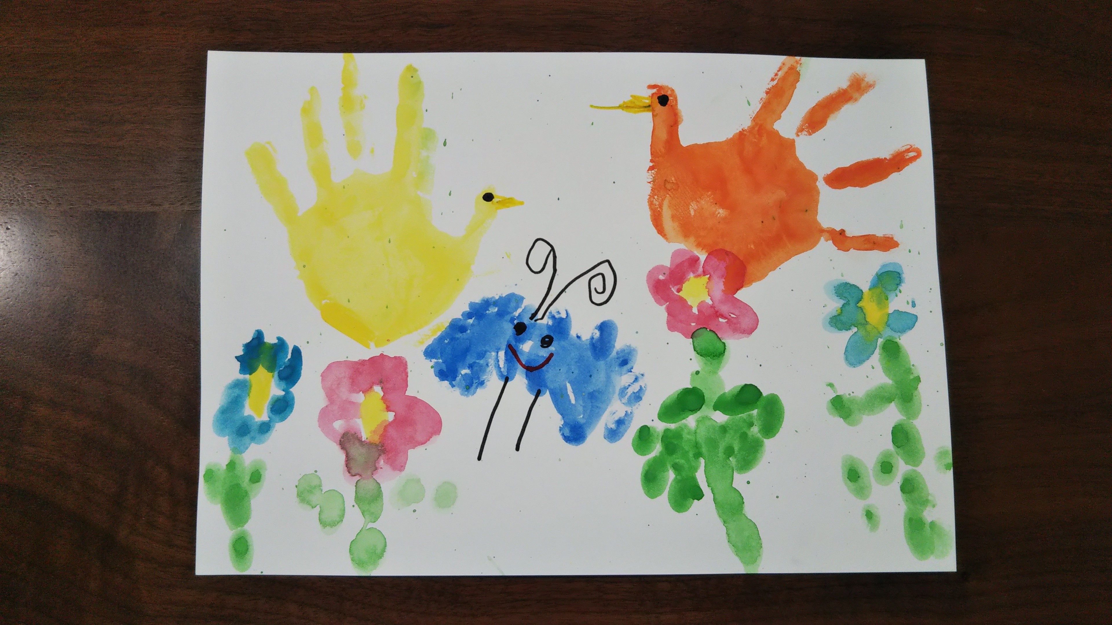 絵の具とおててで沢山お絵かきしたんだね!おてて絵の具が鳥さんに変身したんだね!その手があったか!