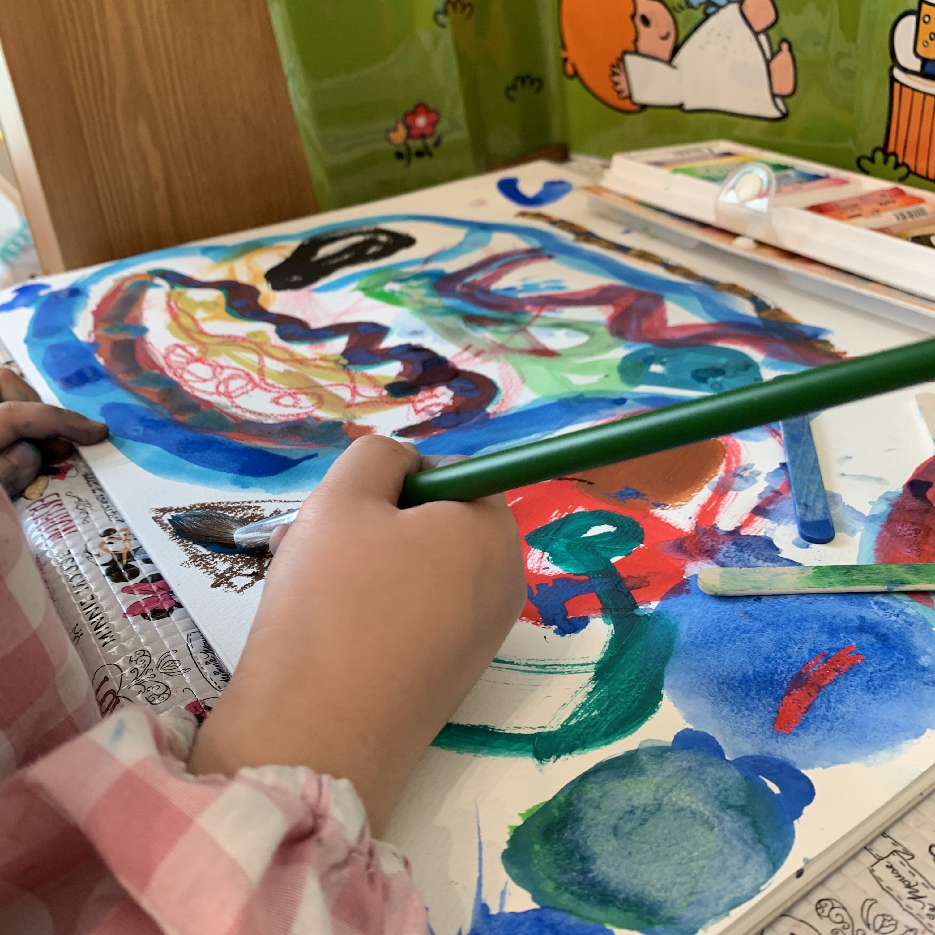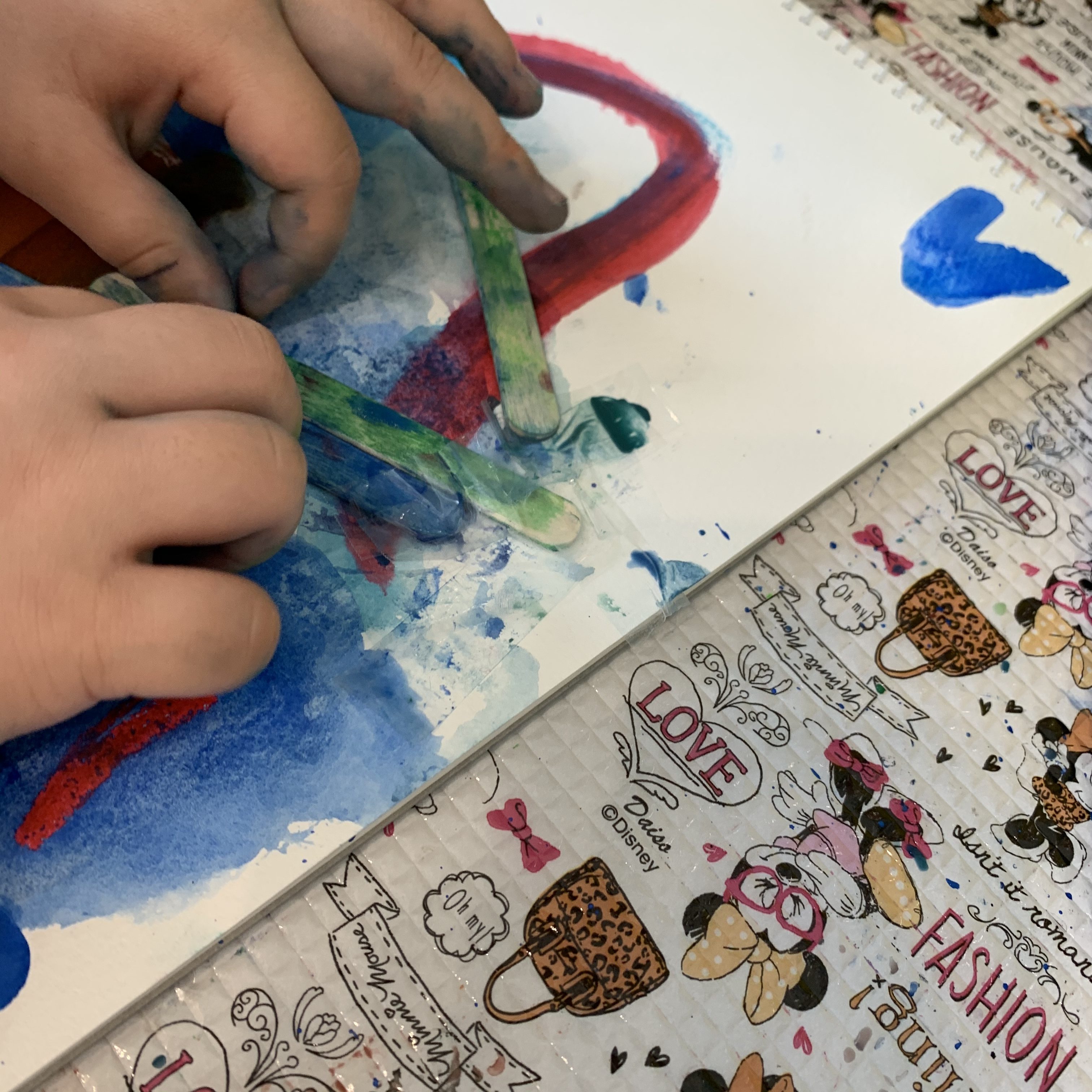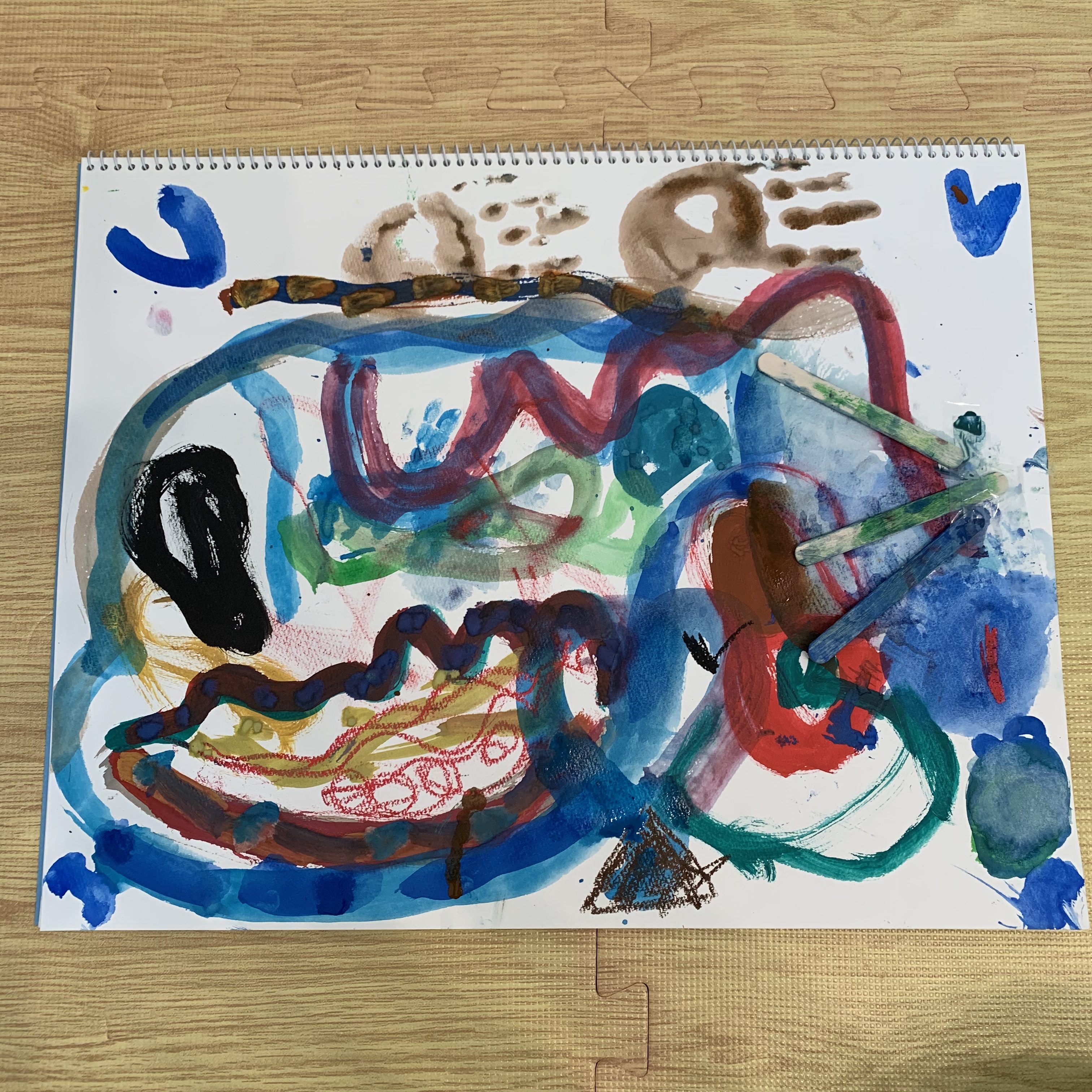 「うわぁ〜すごーい」を繰り返しささやきながら、絵の具の重なりを楽しんで描いていました。「ハートを描いた」とは教えてくれたのですが、そのほかは何を描いたのか、はっきりわからず…ただ、筆で線を描くのが気持ちいいんだなという感じがしました。