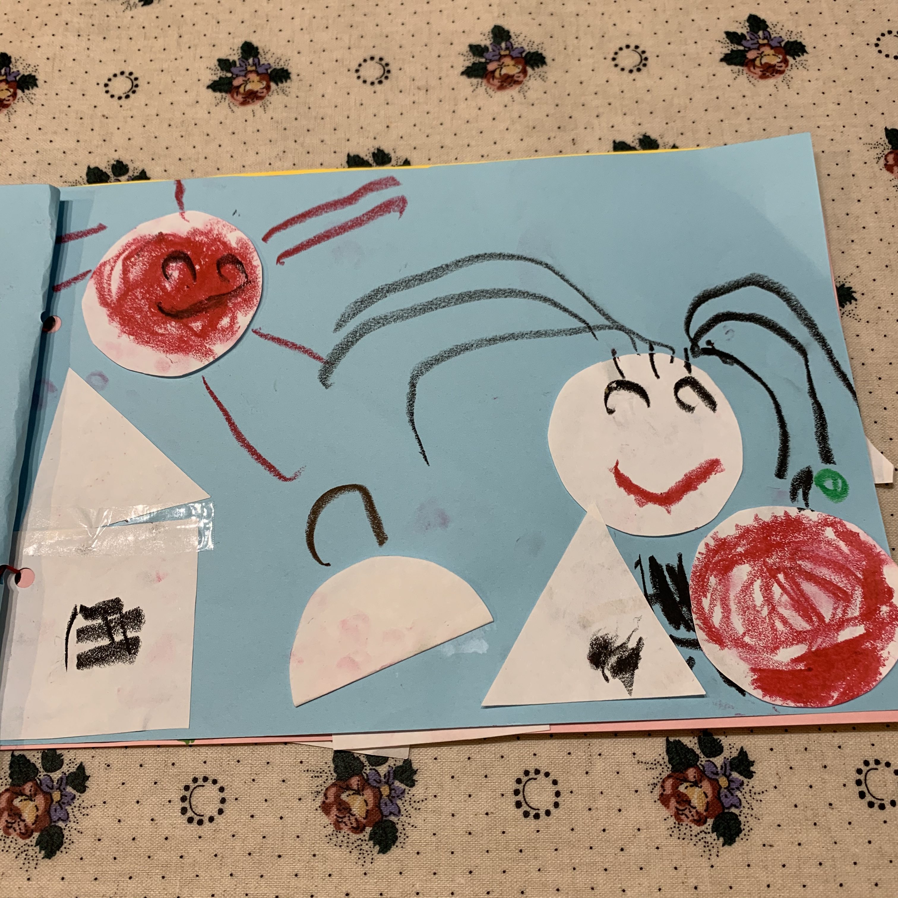 全てのページをおはなしとしてつなげていくのは、年少さんの年齢ではなかなか難しいところかと思います。まるや、さんかくなど単純な形から、見たて遊びをしながら、これだけの発想が広がったことがすばらしいことです✨たくさん褒めてあげてください☺️