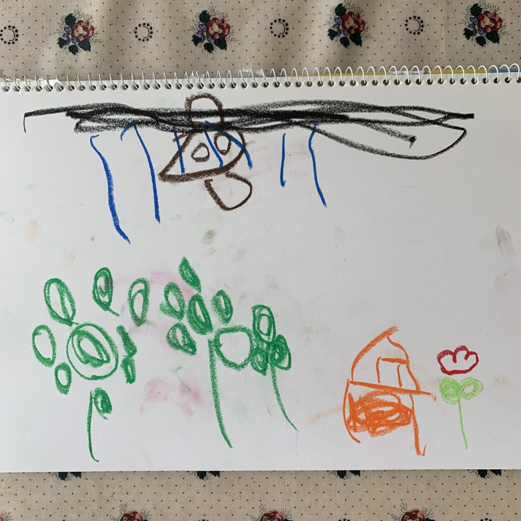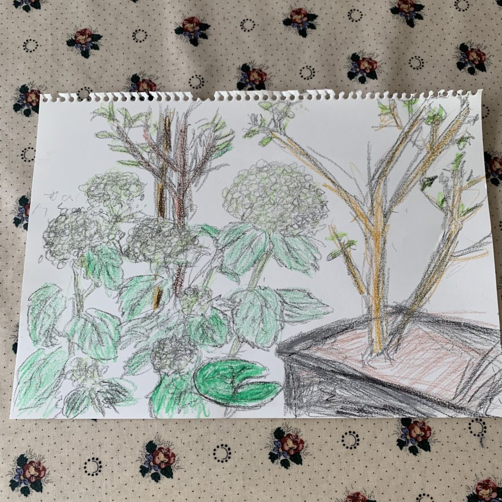 ●2枚目→左下は庭のあじさい。途中でヘリコプターが通って、「ヘリコプターだけど、飛行機を描くの」