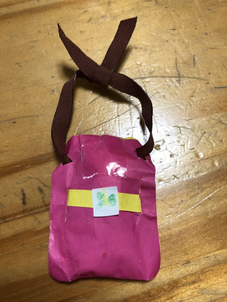 学校の名札に付けるミニミニお守りを作りました。折り紙とリボンを使いました。