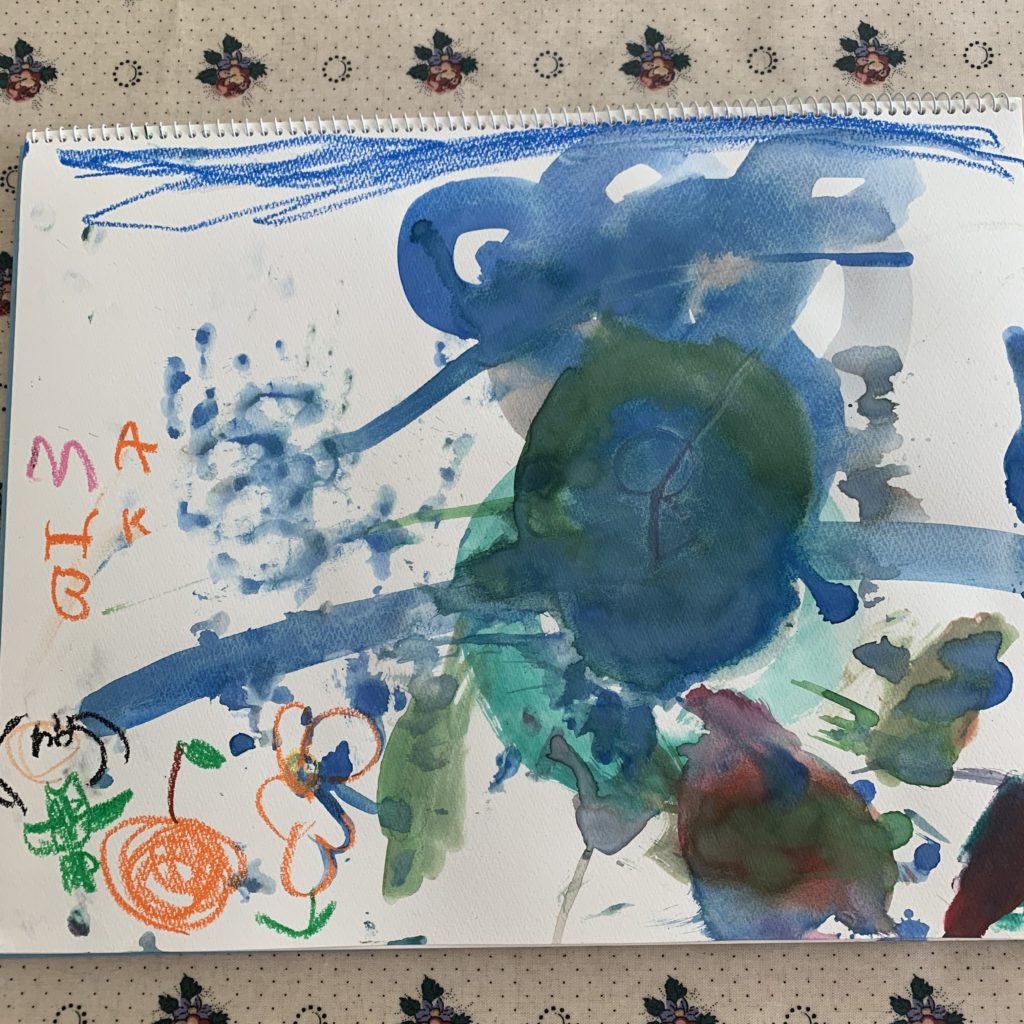 2枚目は「パレットが足りない」といって紙の上で大胆に色混ぜしたり、気持ちが発散されたのか手で塗り塗りが始まりました(^^;