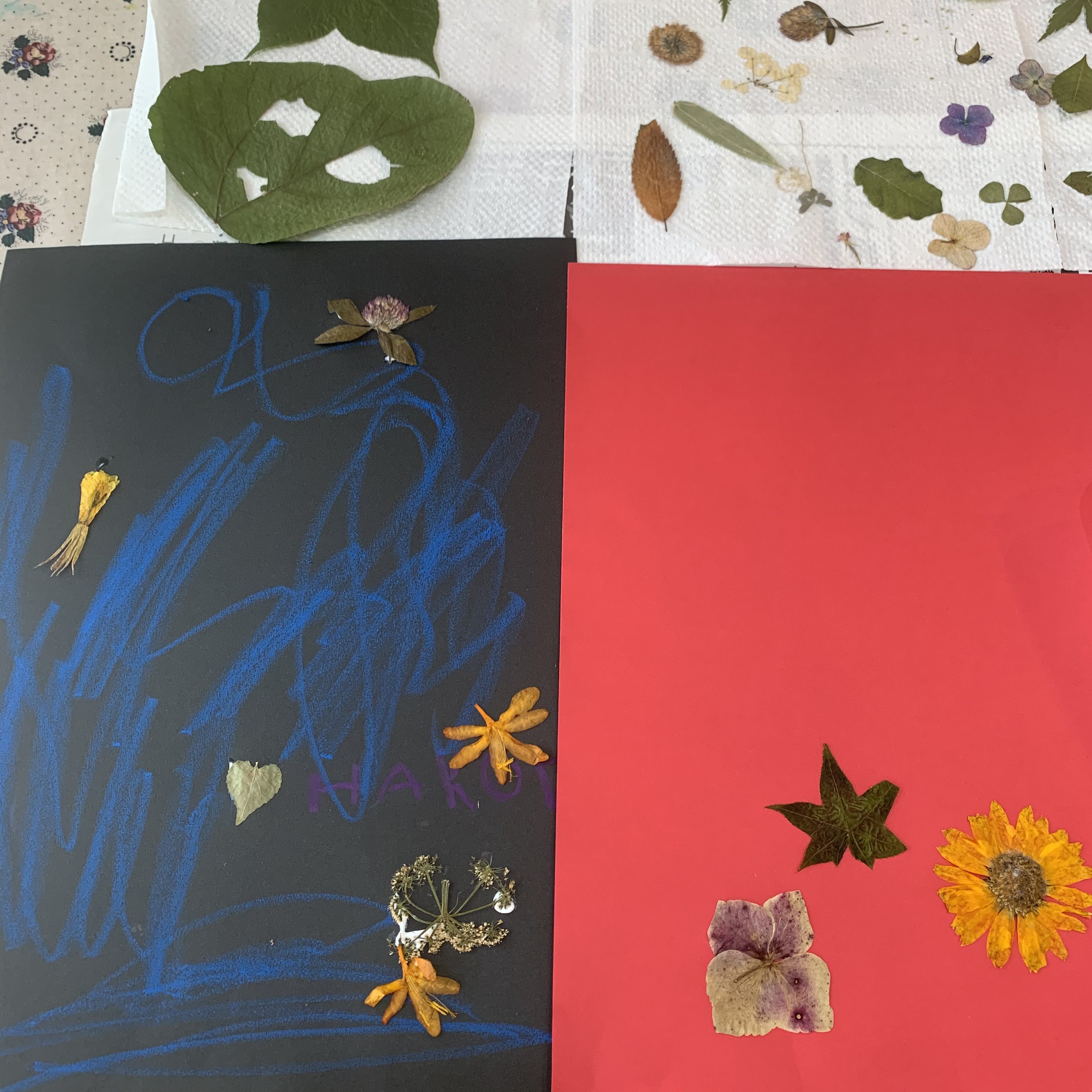 以前、お散歩で一緒に見つけた野花、家で育てているひまわりなどを電話帳にはさんで押し花を作っていて、それを色画用紙に貼りました。