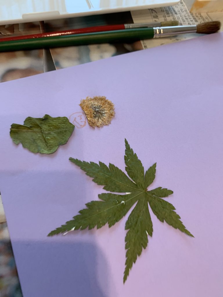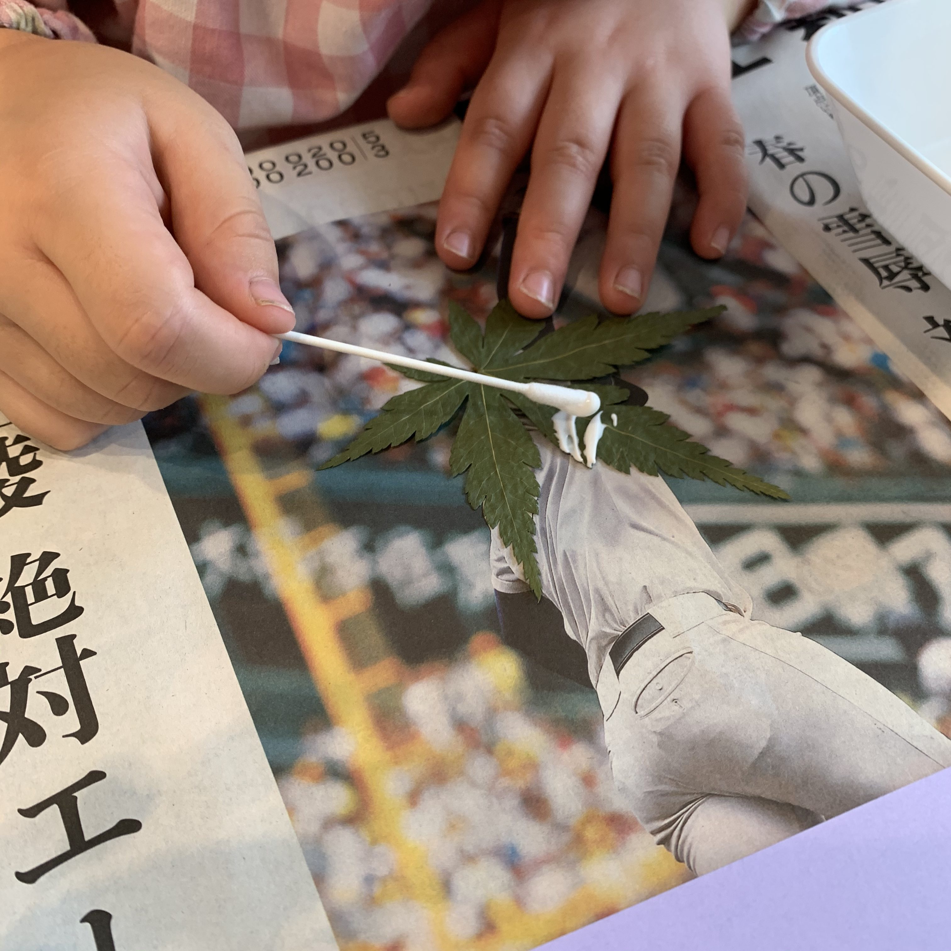 最初、テーブルの上に全て置いて制作していたのですが、とっ散らかってしまったので(笑)床にシートを敷いて、押し花を貼るコーナー、お絵かきするコーナーをそれぞれ作ったら、「ここで貼るんだね!」「次はお絵かき〜」と合点がいったようでした。押し花を貼る作業もなかなか集中力がいるようで、その後お絵かきをしたら、へとへとな感じでしたが、いい経験になりました