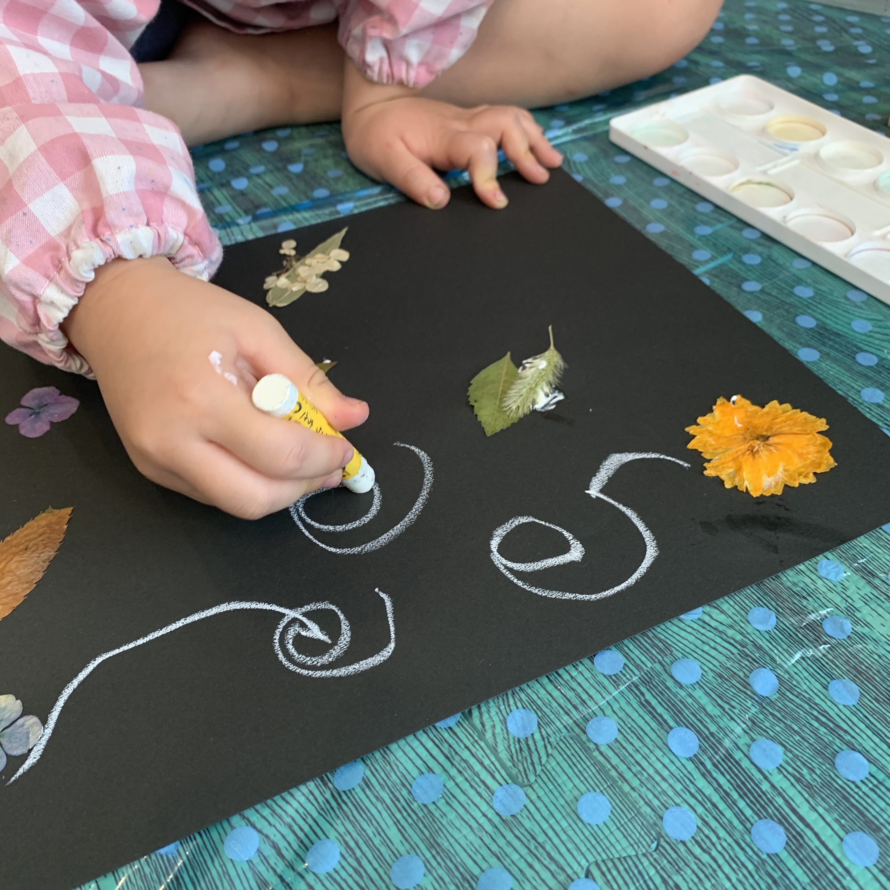 押し花を、太陽やボート、ちょうちょなどに見立てて描いていましたが、最終的にどれも線を描くのが楽しくなったようです。