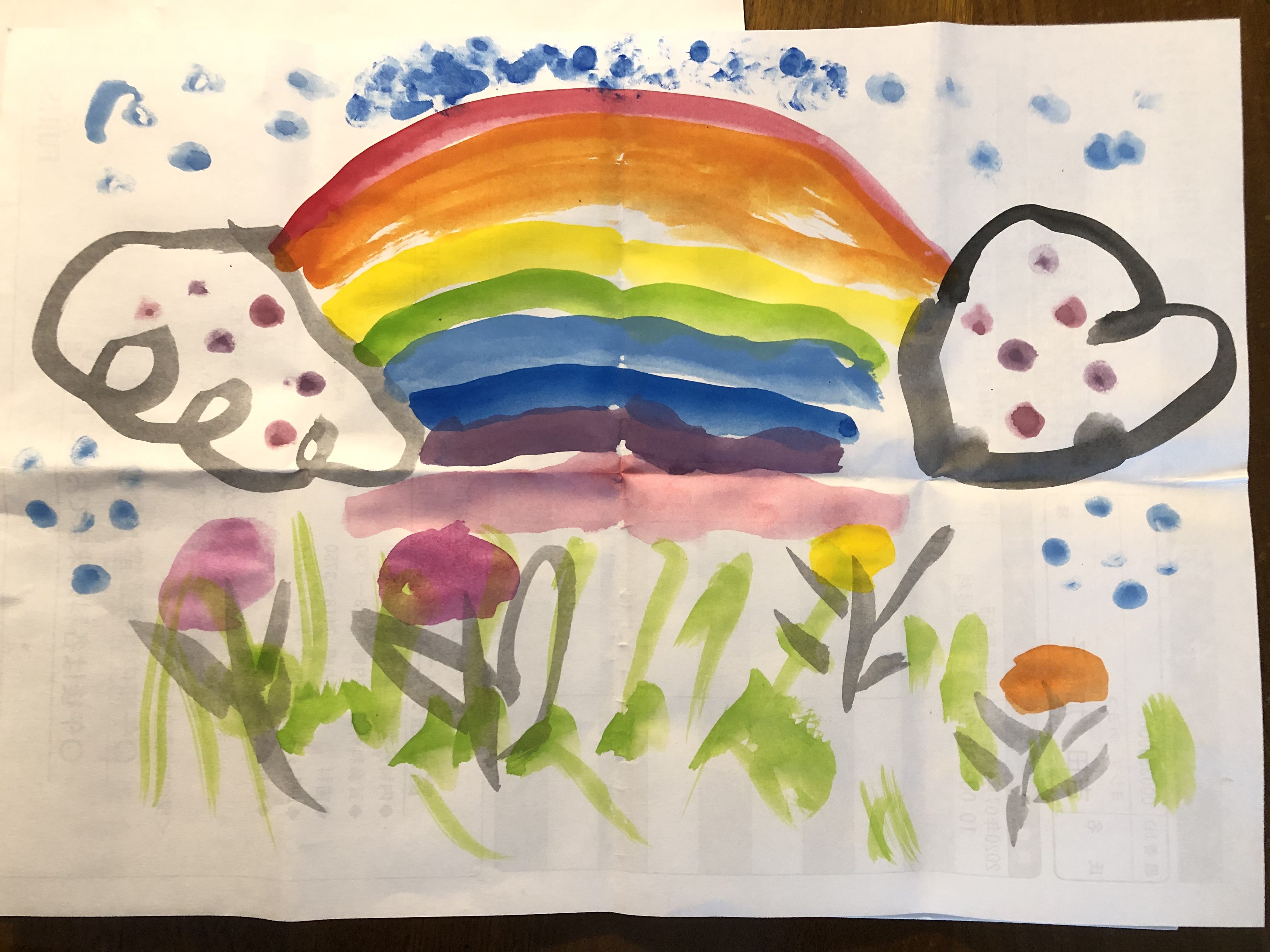 最後の1枚は空想です。タイトル「虹の下で」。虹の始まりがハートの雲で、終わりが猫の手の雲だそうです。
