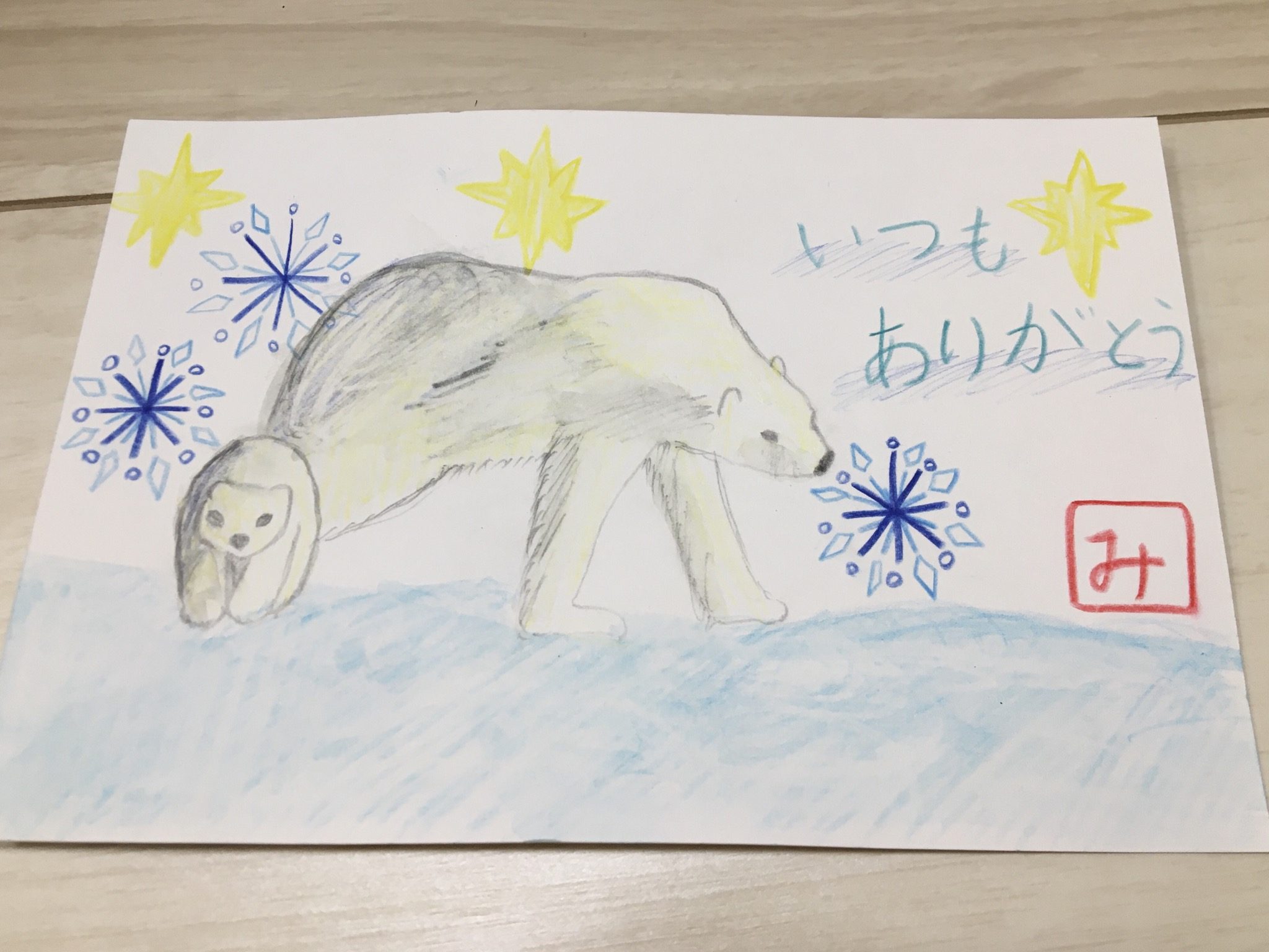 水彩色鉛筆を使って、水でぼやかしながら描きました!