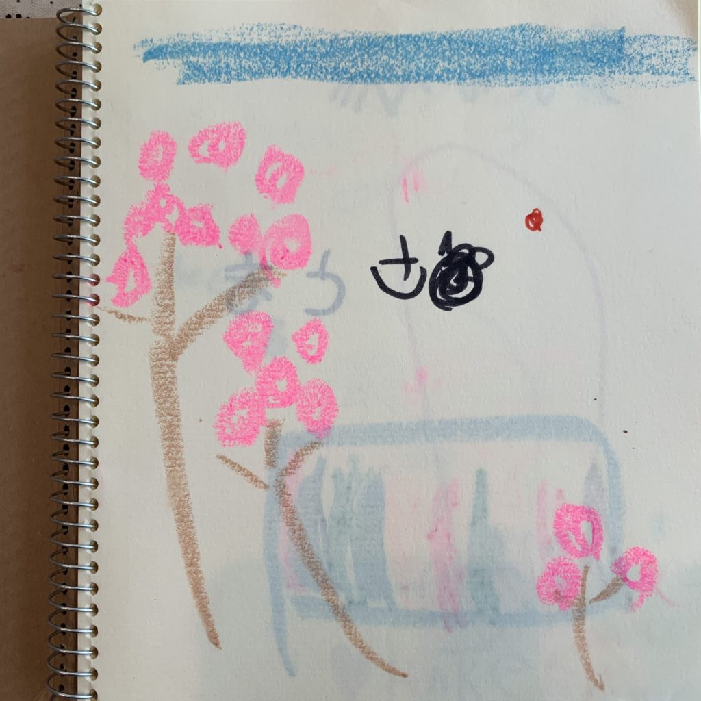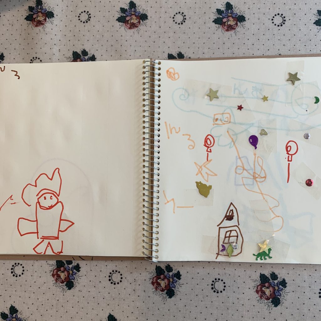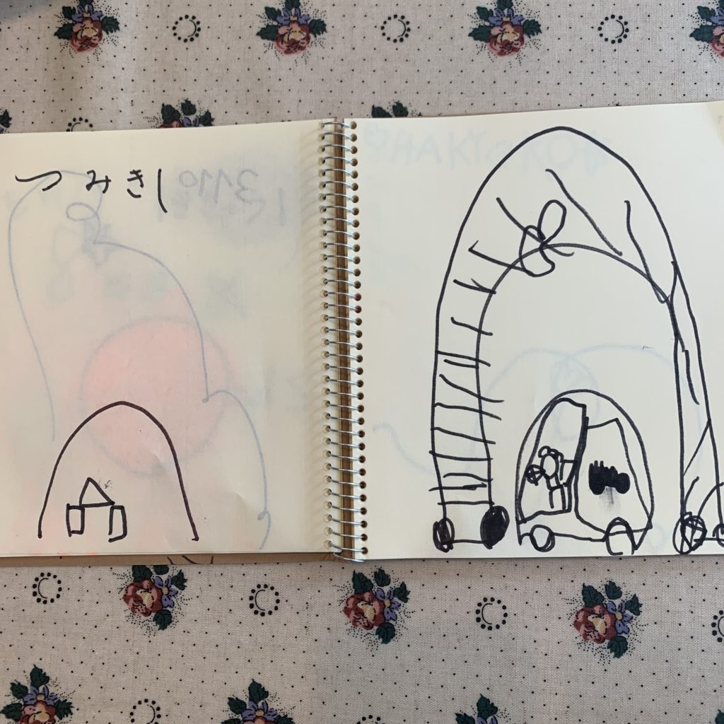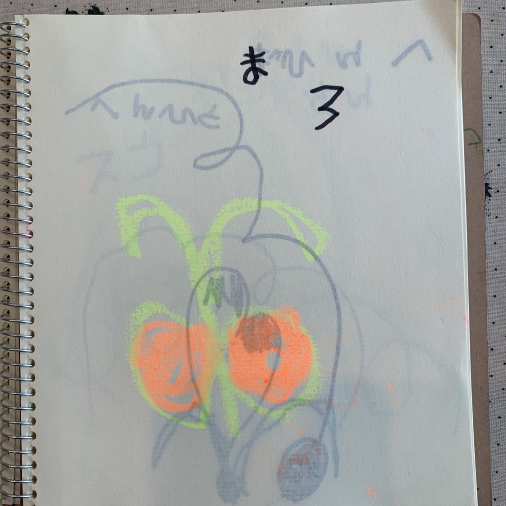 クレヨンとあわせて、どうしても欲しい!と買った小さなスケッチブッグに「これ絵本なんだよー」と毎日書き足しお話ししてくれます。