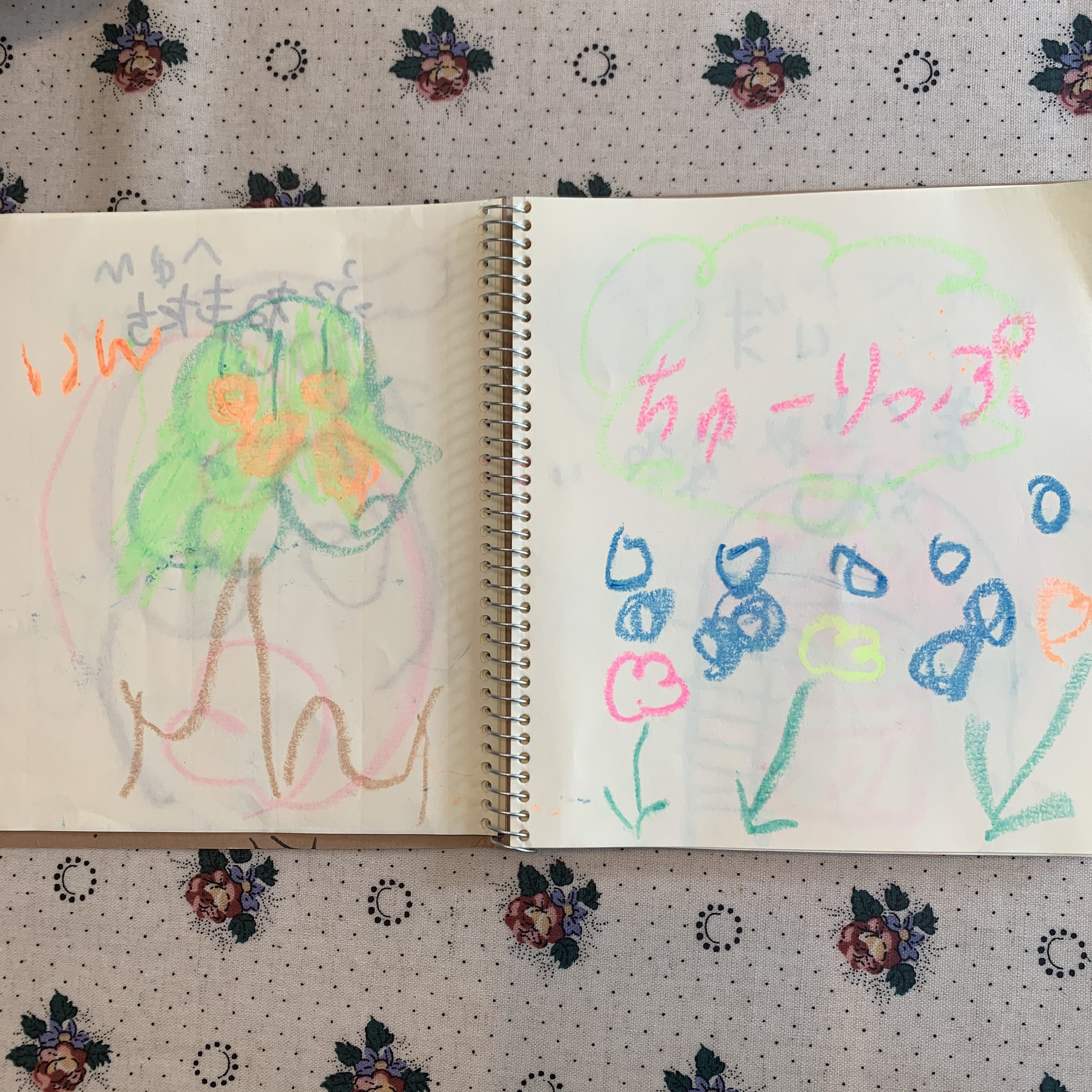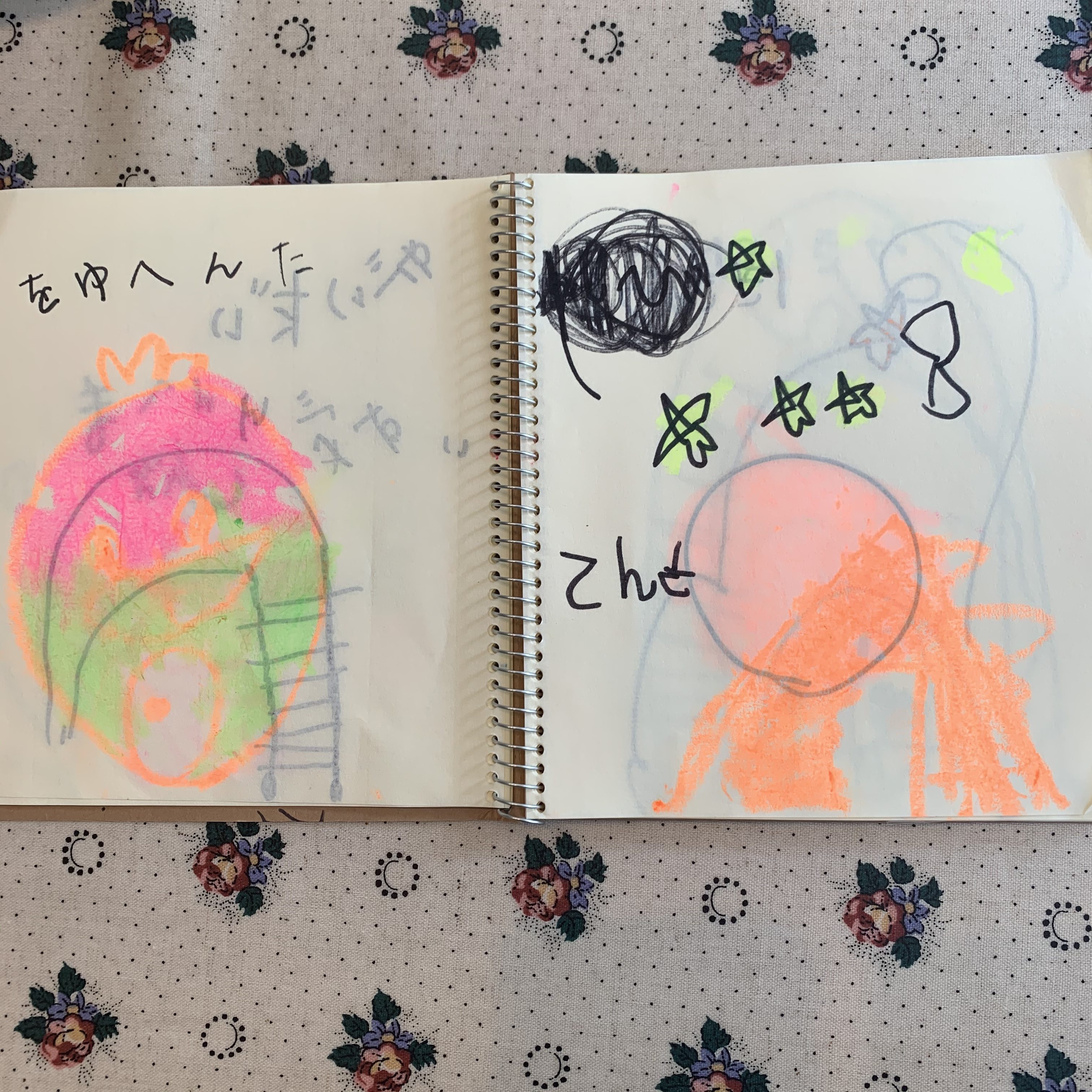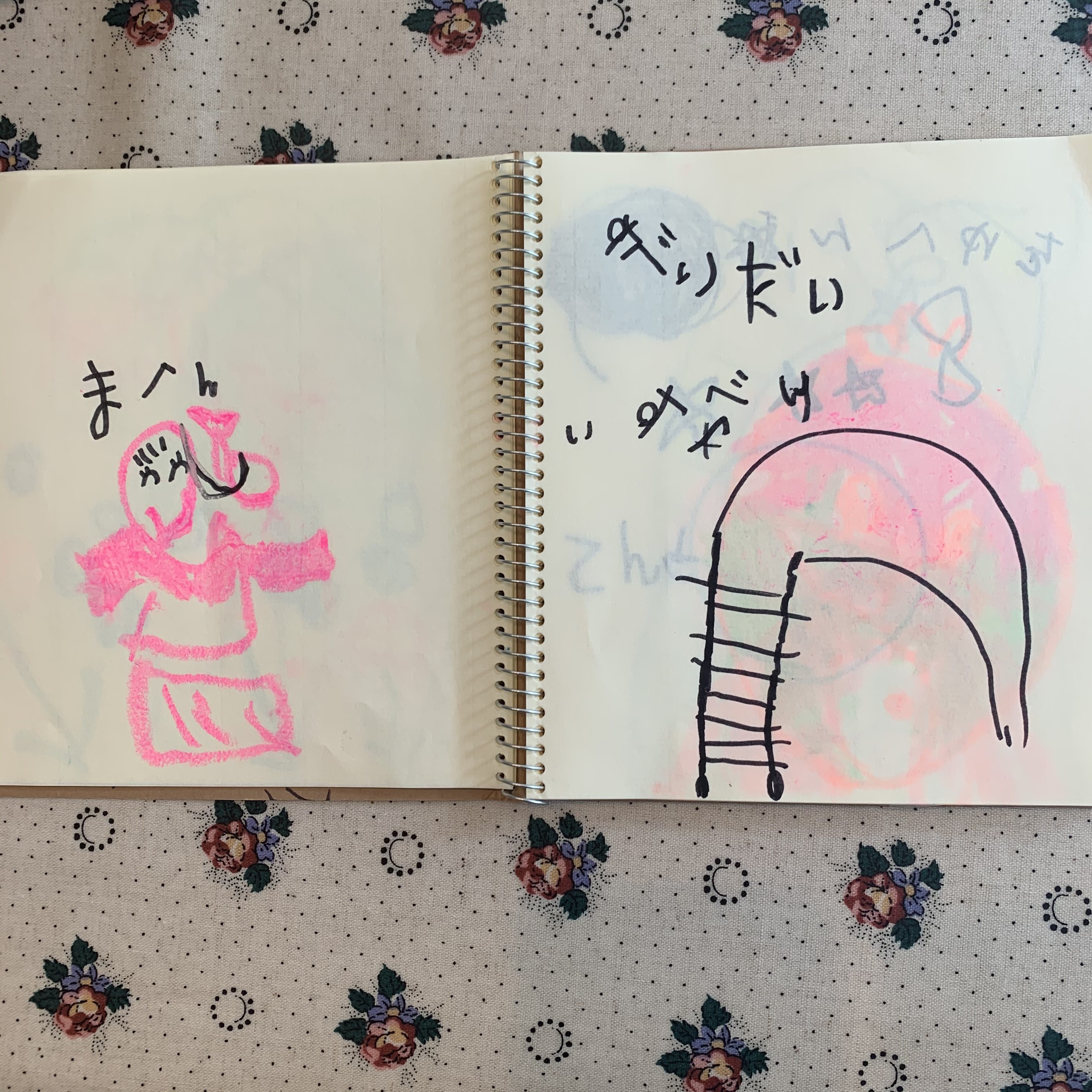 クレヨンとあわせて、どうしても欲しい!と買った小さなスケッチブッグに「これ絵本なんだよー」と毎日書き足しお話ししてくれます。