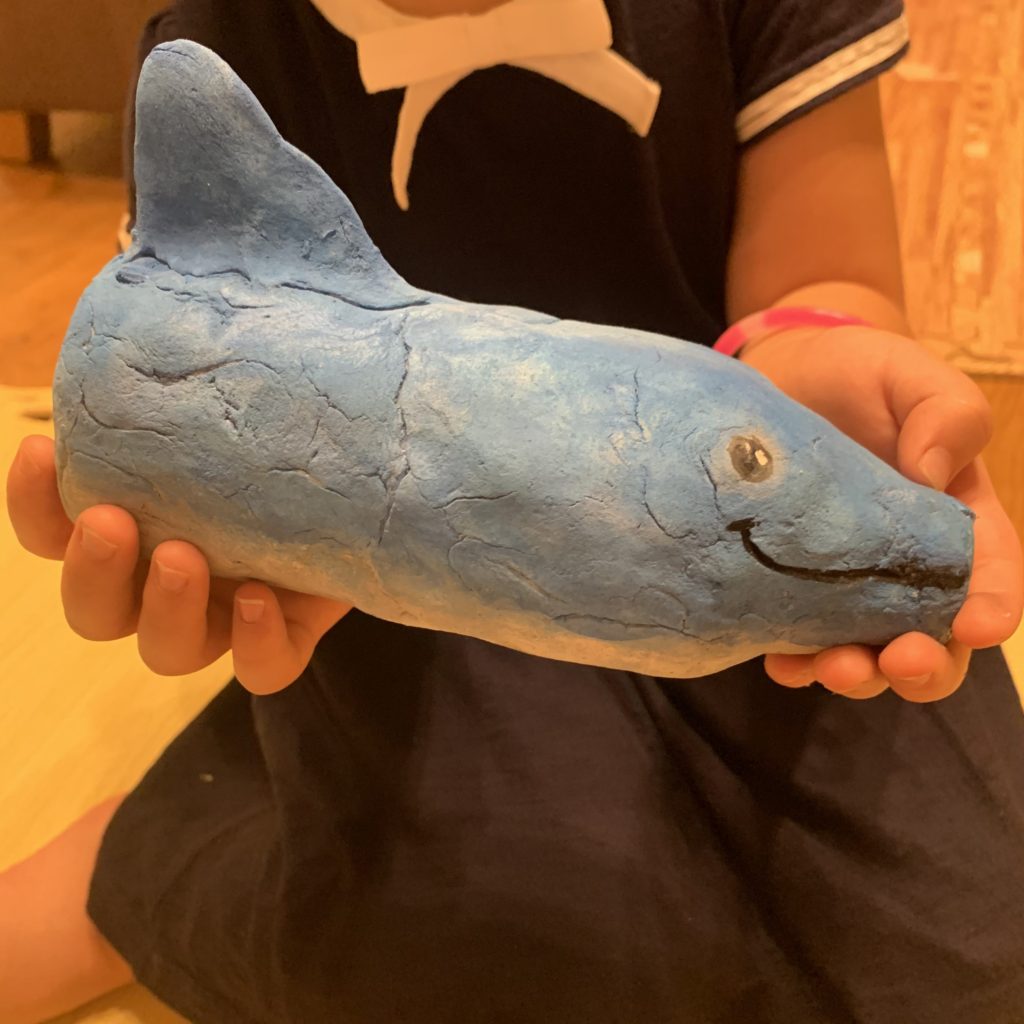 猛暑であまりに暑い午後は涼しい部屋でじっくり工作がいいですね!お父さんも「工作してるとあっという間に時間が過ぎるね〜」と話していました。イルカ褒めて頂いて嬉しそうでした