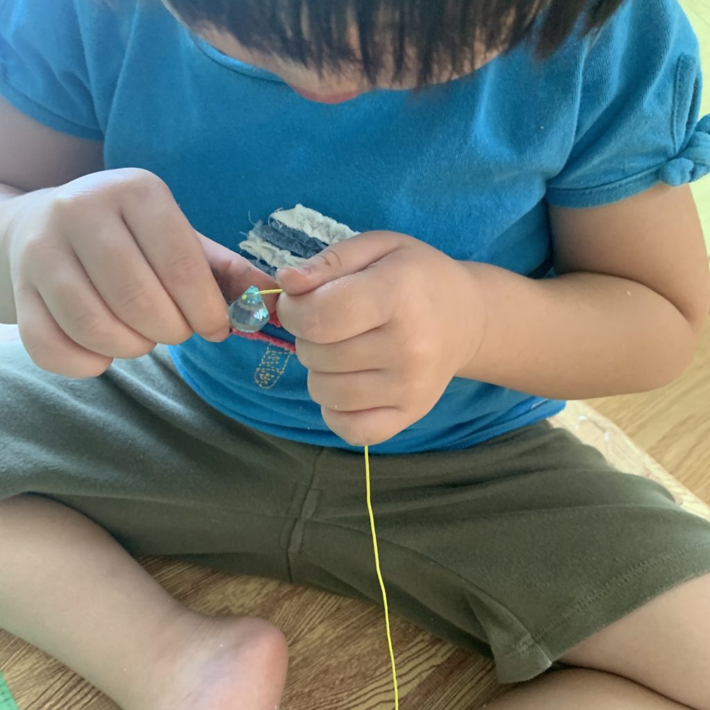 ビーズに紐を通すの難しそうなのに一生懸命なのが可愛らしい