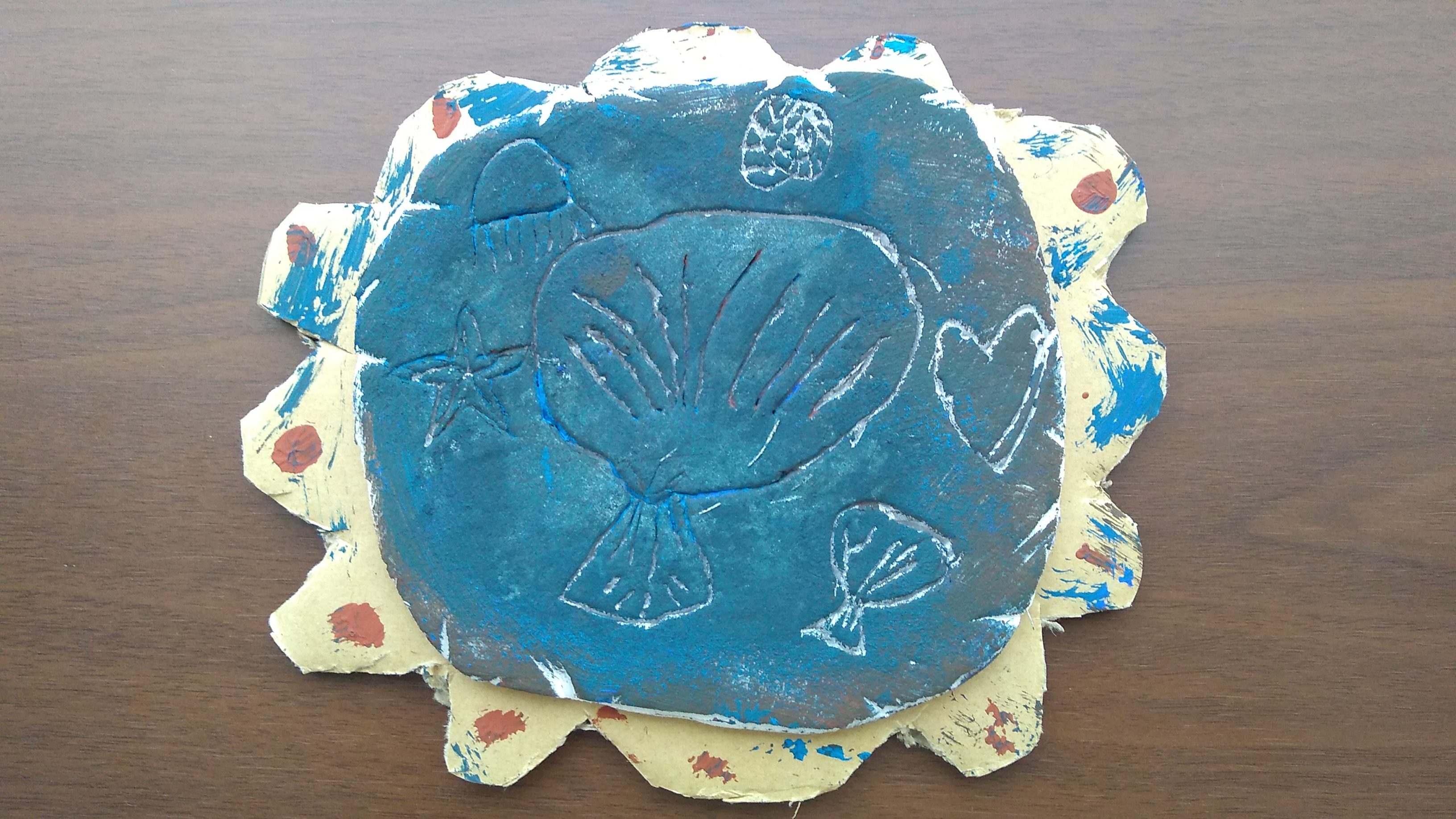 色を重ねてみました。使った色は、スカイブルー、コバルトブルー、バーントシェナーです。周りの土をかわいく切ってみました。ダンボールを切るのは大変でした。右側のハートは、真ん中の貝の真珠です。