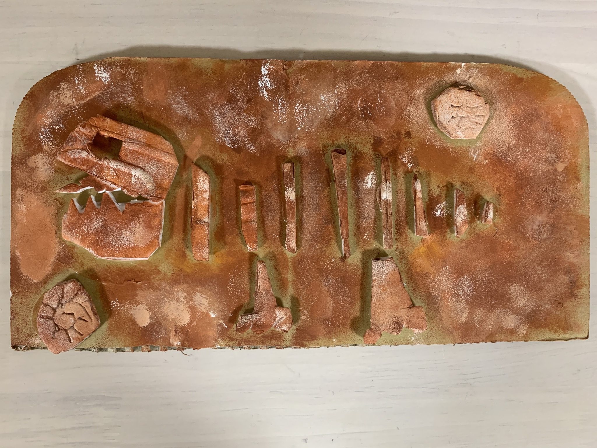 土の色に白を加え、アンモナイトの白い色と合わせて古代感を際立せたかなぁ?と。