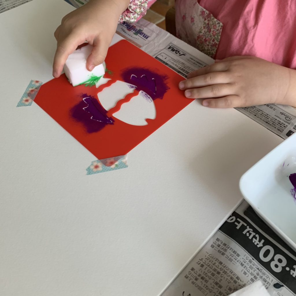 かたがみをつかったステンシル! たのしいね! ポンポンしてかたがみをはずしてみると、えができてるって、まほうみたいだよね! クレヨンやマーカーでおえかきして、すごくたのしいえになったんだね! ステンシルでまた、すごいのできたらおしえてね!