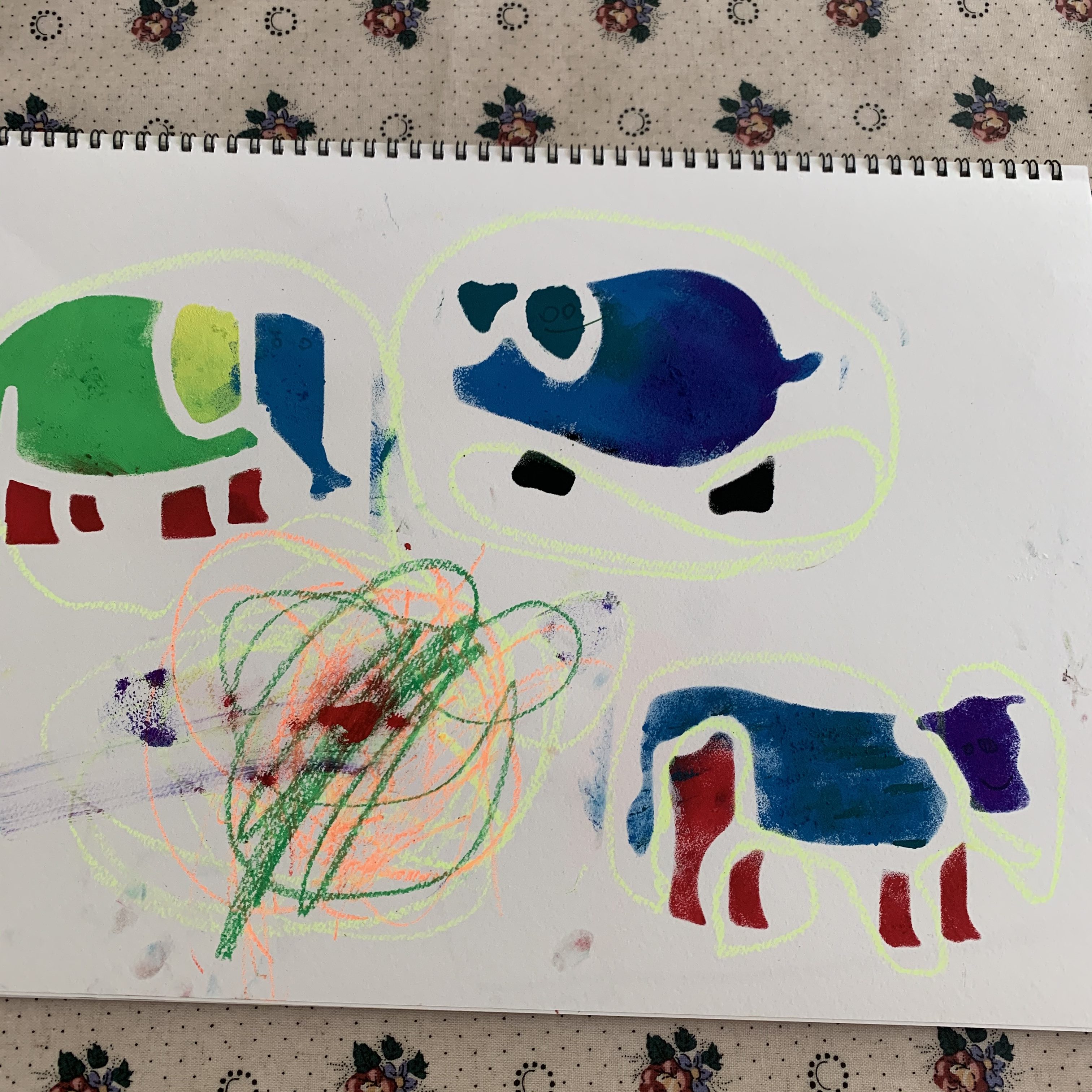 1枚目はステンシルのパターン?の中をクレヨンで塗って、2、3枚目はスポンジでトントンしました。「カラフルにしたーい」とのことで、色とりどりの動物さんになりました。